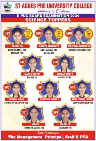 Sannouncethestellarperformanceof its students in the Karnataka School Examination and Assessment Board 2024. Leading the science stream with extraordinary achievement, Anjali R Rai dazzled with a commendable total of 592 marks, showcasing her academic prowess with perfect scores in Computer Science & Kannada. She has made usproudbysecuringthe7th Rankat the State Level. In the commerce stream, Ashmitha Pereira stood out