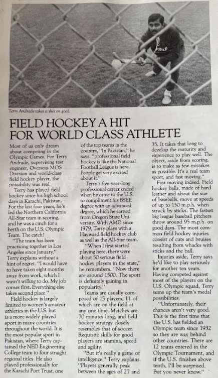 Take a look at what Terrance Andrade has said of himself, it was fortunate to stumble on these lines to enhance this brief story......Terrance Andrade, nonchalantly says, "Speaking about the Olympics & Scientists / Engineers brings back Nostalgic Memories of My Past Life and PerformancesinthefieldsofSports as well as my chosen Professional field of Electrical & Computer Engineering...........in Pakistan & the USA from 1968 to 1984 - I had the Constant Battle right from Age 17 when i could have " most likely based on my Performance " been selected for the Pakistan Olympic Hockey Team that Won the Gold
