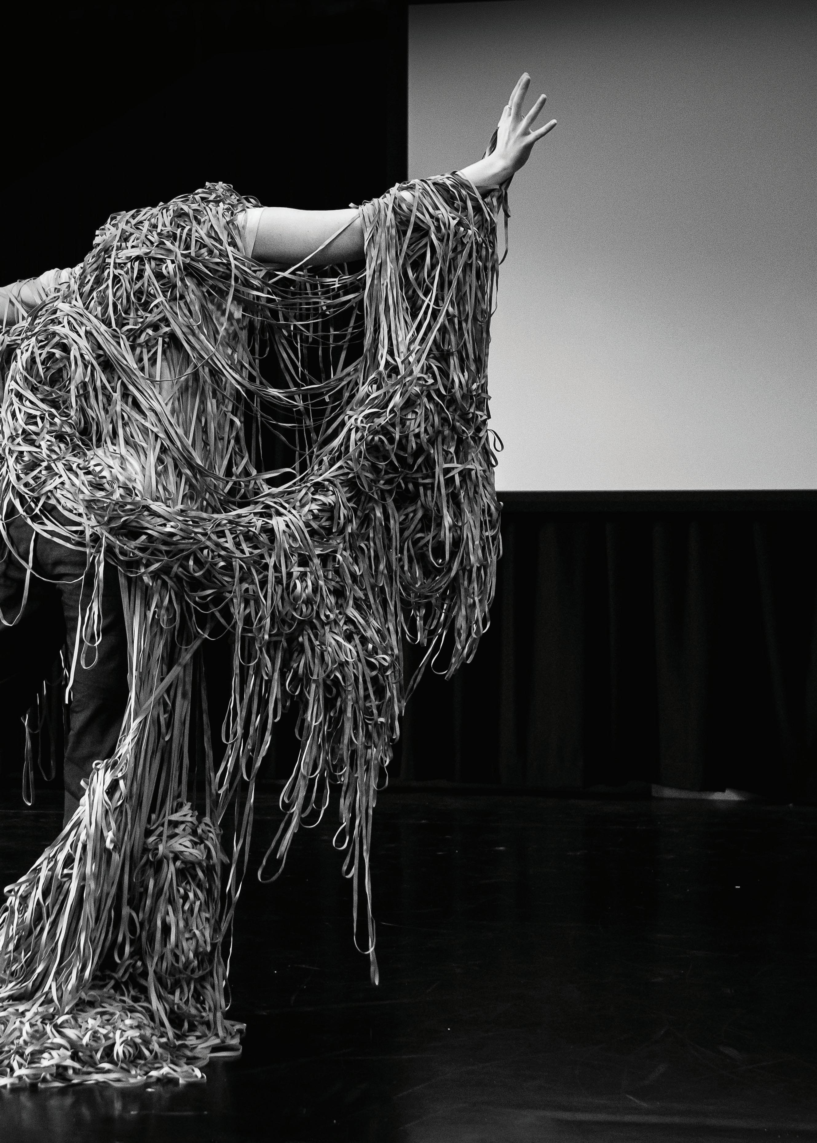 The process of creating Hold and Seep involved the dancers experimenting with the material and responding to its form, smell, texture and movement to create choreography that is performed in direct connection with and alongside this same object.