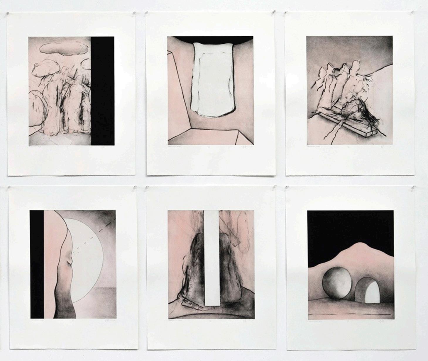 On my return in 2000 the building resembled an abandoned junkshop, covered in cobwebs, dusty drapes, rat droppings, and yellow newspapers dated 1982. The big etching press was there, alongside all of George’s printmaking equipment. This included rickety wooden workbenches, pots of solid inks, and rollers and brayers, all melted à la Dalí, symbolic of time and gravity. After the indescribable process of cleaning and ordering the studio space, helped by many wonderful friends, the Baldessin Studio was a newly born entity.