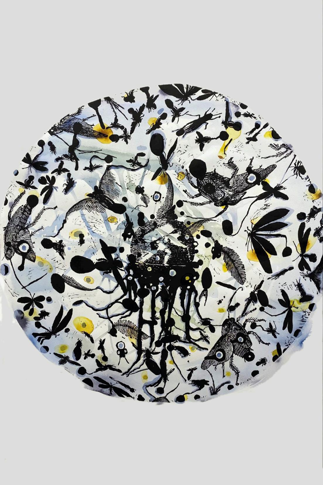 Resonance 2: Fossil (heart urchin) 2022 monotype, watercolour and etching ink on paper, stencil and letterset 110 x 76 cm unique
