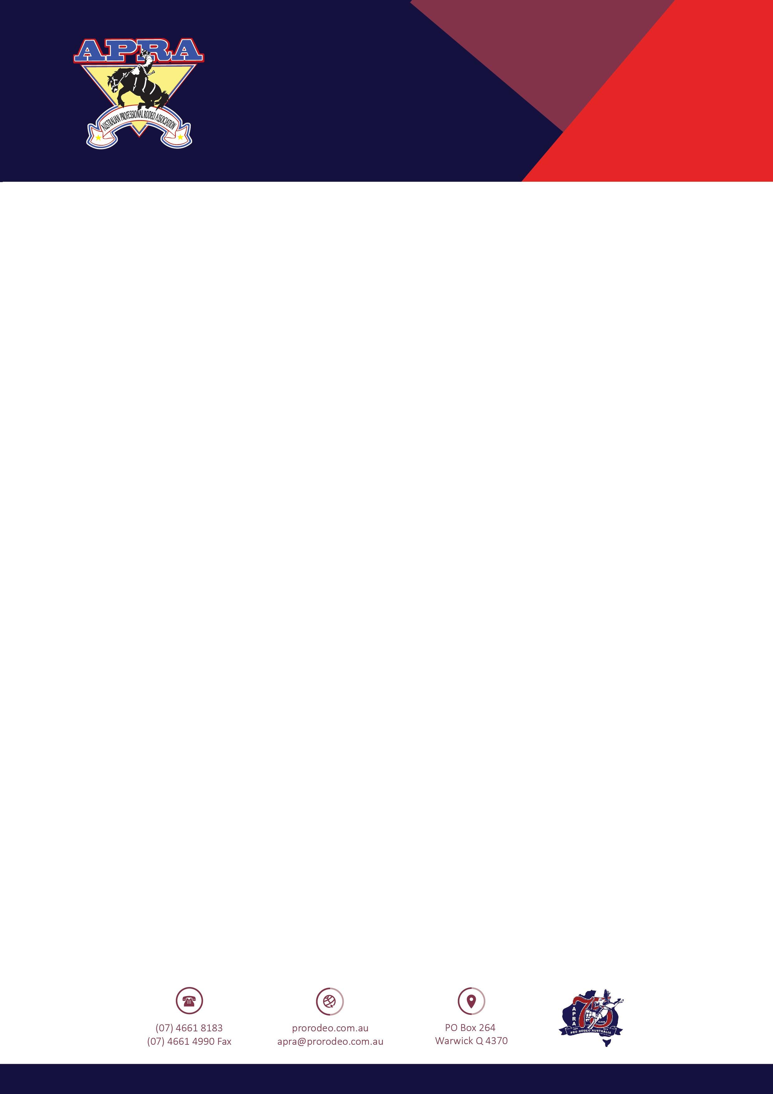 Memberships are due this month and renewals can be paid via direct debit into our account, by card on contacting the office or cheque in the mail. Memberships will need to be current to enter events in October. If you are paying by Direct Debit, please use your membership number and name as a reference so we know which member is paying. If your contact details and bank details have changed, please fill out a new membership form – these can be found on the website www.prorodeo.com.au under the APRA INFO tab APRA MEMBERSHIP.