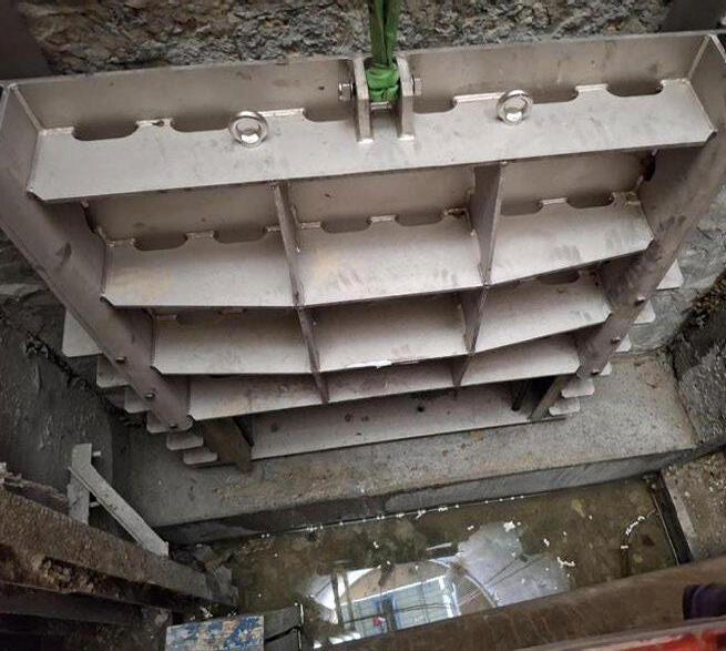 Installation at depths of up to 13m, integration within existing concrete block-outs and mountings and accommodation of a sloping chamber wall required tailored engineering solutions.