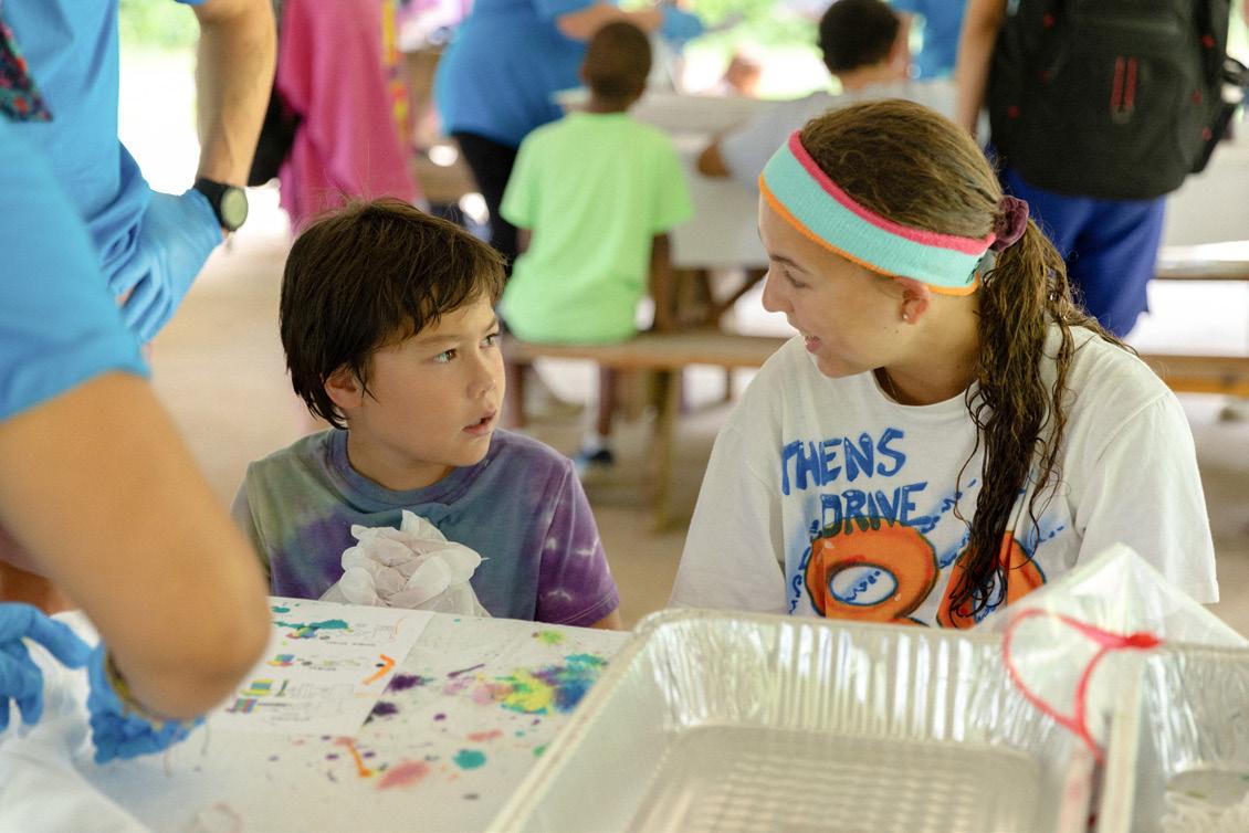 coming to Camp Royall has grown. This July, 24 volunteers came to camp for a special tie-dying activity with the campers. Working side-by-side with the children, they shared the fun of creating colorful, one-of-a-kind t-shirts and bandanas. For the campers it was a chance to exercise their social and communication skills while proudly creating a unique piece of artwork to wear and call their own; for the volunteers it was an opportunity to see how the inclusive and accepting community at Camp Royall makes a real difference in the lives of individuals with autism.