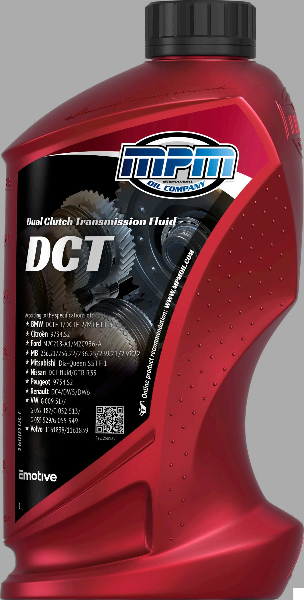 Táto špeciálna prevodová kvapalina 16000DCT – Dual Clutch Transmission Fluid je špeciálne vyvinutá pre mokré dvojspojkové prevodovky vo vozidlách s prevodovkami DCT. Kvapalina do prevodovky s dvojitou spojkou MPM spĺňa požiadavky High-Tech, obsahuje špeciálne prísady pre mokré spojky a ponúka vylepšený výkon. Vzhľadom na priebežný vývoj v posledných rokoch bol názov produktu aktualizovaný tak, aby lepšie odrážal jeho špecifikácie. Nový názov je teraz lepšie zladený so špecifikáciami pre prevodové oleje pre dvojspojkové prevodovky a teraz navyše zahŕňa niekoľko nových noriem automobiliek, pozrite nižšie.