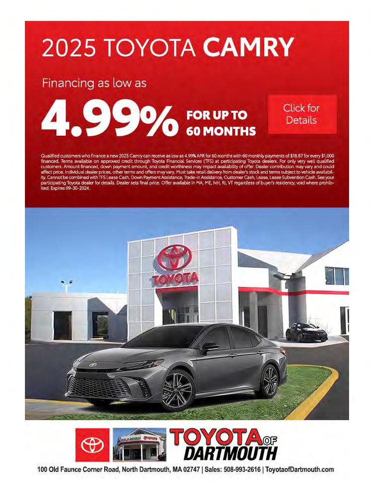 Ova!ified customerswho ftMncc a new 2024 RAV4can recei\<eas tow as4.995£m. Jor60 months ","!h60 m:inlhty paymcnl'I of $18.87fo, e>lefY$1,000 financed_Terms .walable on appl'O'Jedctedlt through To,t>taAnande.i SeMces (T'FS) at partiC_oating:TO)<>tadealers. Fot only veiy well qualilled customers. Amount financed, 00\-'lnpayment amount. and credit worthiness mwt Impact .wailablllty of ofter. Dealer contnbution may vary and could aFact price. lndMdual daa',,erprices. other terms and off'ersmay vary.Musttake retaildei,ve,y fromdaa!e(s stock and tetMS subject to whi~ availability.C.llnr.otbccombircd withTfS Lc.i~cU>sh.Down Paymo,'-tAs.s~nco, Tradc-·inAssistanco,Customer Cash. '.._c&SC,LooseSvbvontion Cash. Soc your p31tidpcting loyota cie.atcrlordeta,:ts. ~tct sets final p(ice. Offc1 avaAabte;,.,MA, ME, NH, RI, vr regardless of bU)'l!r'sresidency;vcxdwhere prohibited. bplres 09-30---202l-.