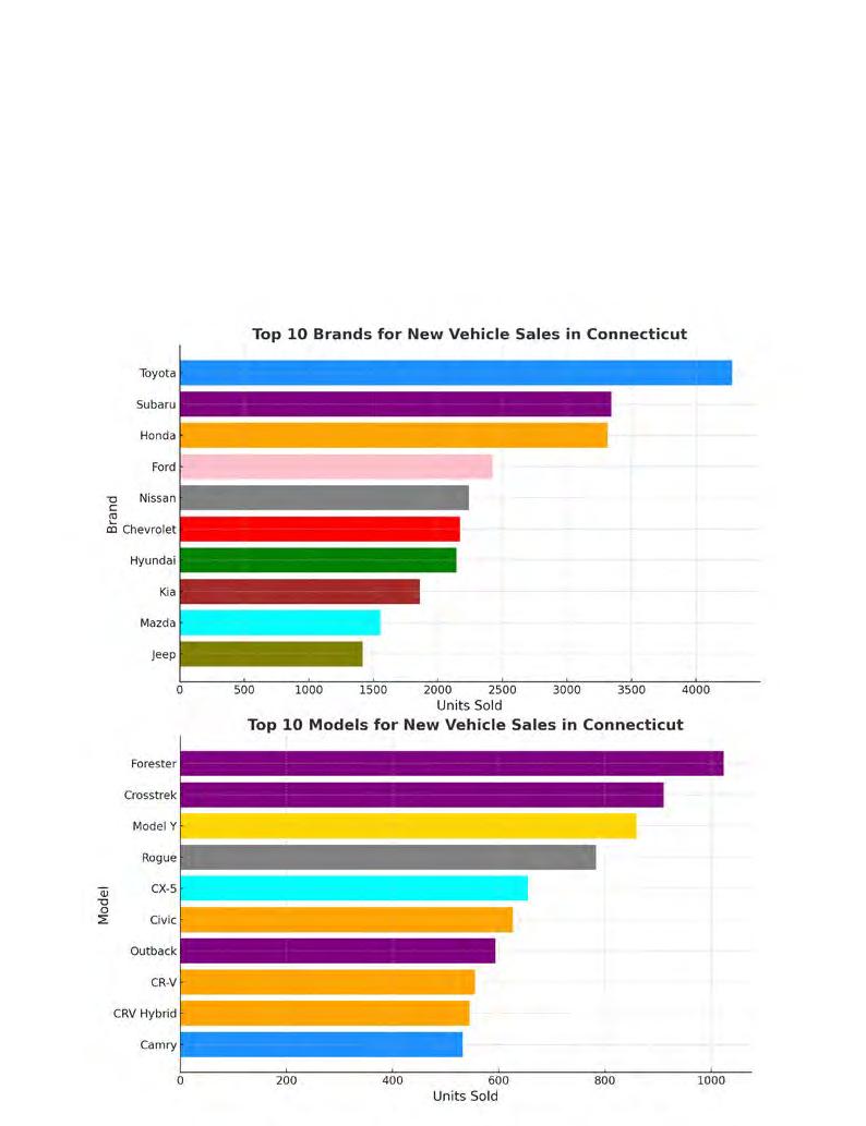 For the first six months of 2024, the top ten brands for new vehicle sales in Connecticut are led by Toyota with 4,279 units sold. Subaru follows with 3,344 units, and Honda is third with 3,316 units. Ford and Nissan complete the top five with 2,424 and 2,242 units sold, respectively. Chevrolet, Hyundai, Kia, Mazda, and Jeep are also notable brands in this market. When it comes to individual models, Subaru takes the top two spots with Forester and Crosstrek being the top selling models in the state, and withthe Outback at number 7, Subaru has three of the best selling models in the top ten. Honda also has three with the Civic at number 6 the CR-V at number 8 and the CR-V Hybrid at number 9.