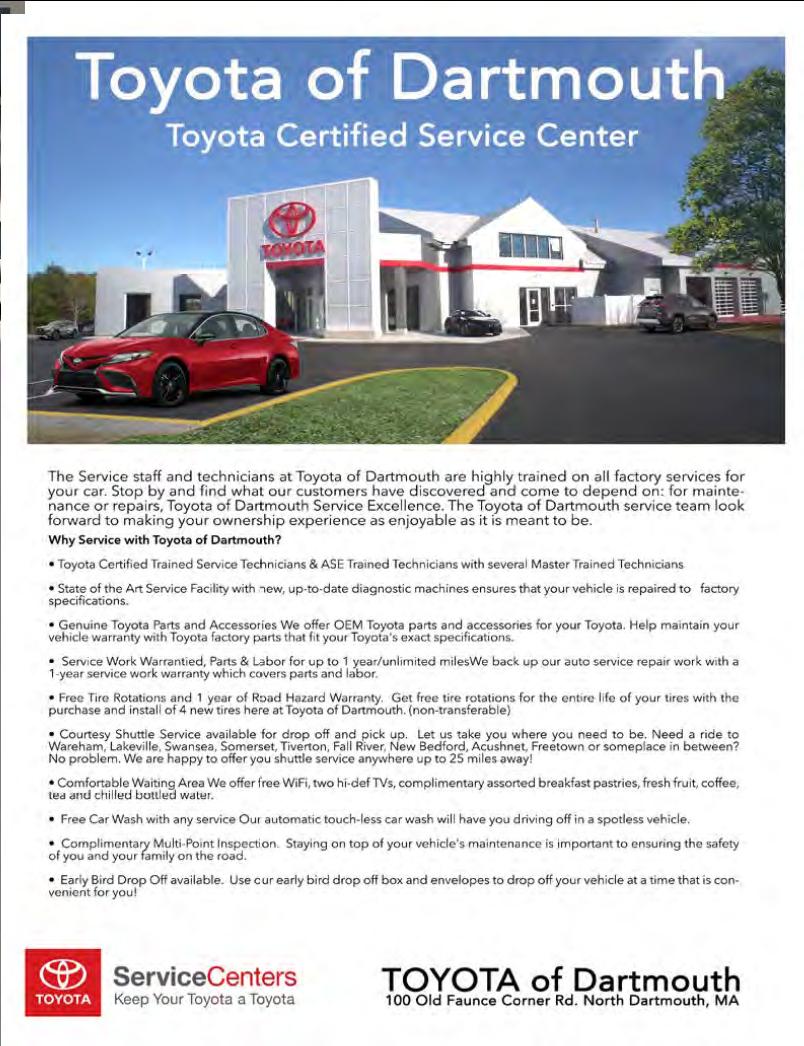 The Service staff and technicians at Toyota of Dartmouth are highly trained on all factory services for your car. Stop by and rind what our customers have discovered and come to depend on: for maintenance or repairs, Toyota of Dartmouth Service Excellence. The Toyota of Dartmouth service team look forward to making your ownership experience as enjoyable as it is meant to be. Why Service with Toyota of Dartmouth?