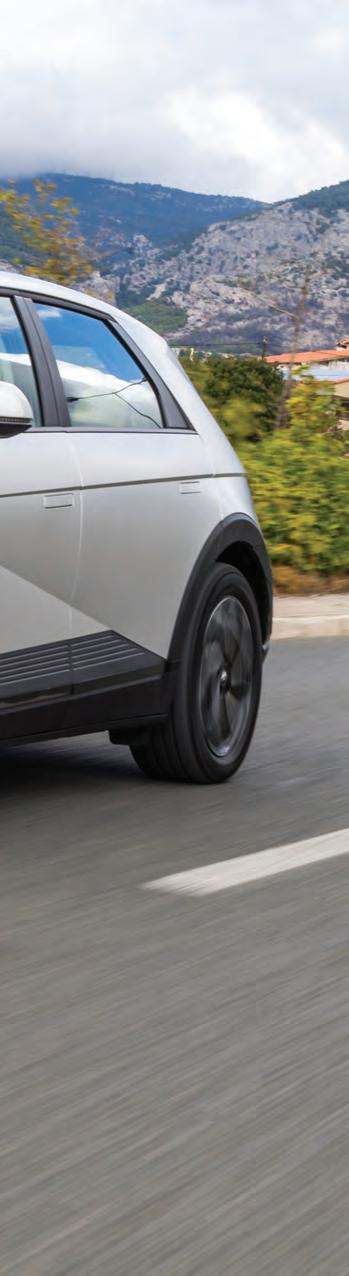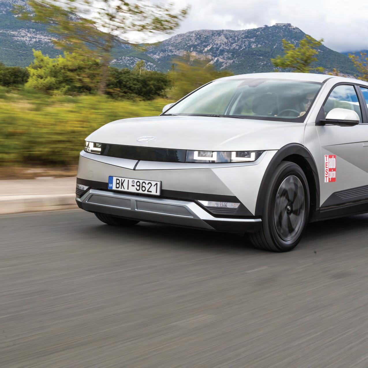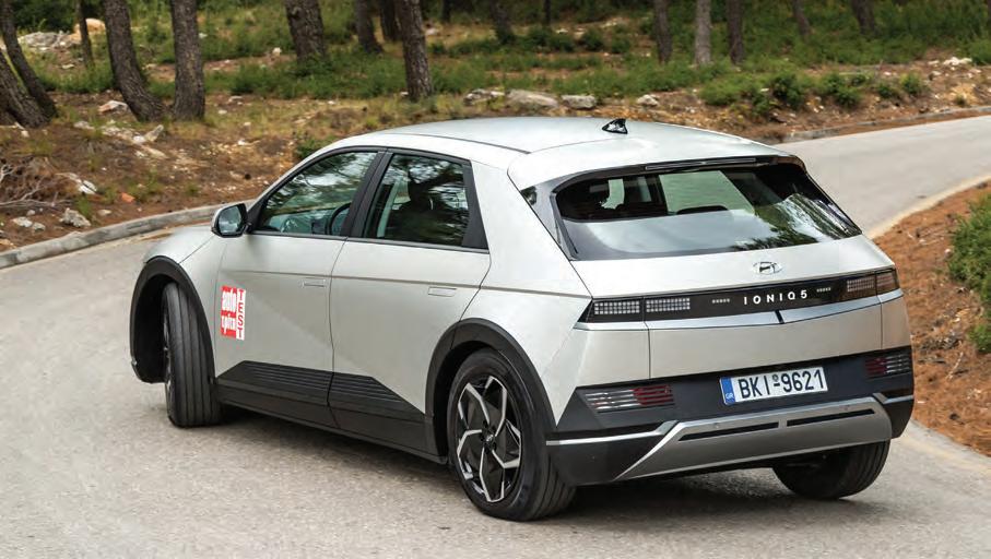 διαμορφώνει ένα τεράστιο μετα ξόνιο 3 μέτρων και επίπεδο πάτω μα καμπίνας. Με 20 πόντους για τα πόδια και 1,45 μ. φάρδος για τους ώμους, χωράει μέχρι και 3 μεγαλό σωμους ενήλικους. Παράλληλα τα πίσω καθίσματα είναι συρόμενα και έχουν ανακλινόμενη πλάτη, όπως συρόμενη είναι και η κεντρική κον σόλα κατά 14 πόντους. Τέλος, επα νερχόμενοι στους χώρους να σημει ώσουμε πως το πορτ-μπαγκάζ είναι μεγάλο, στα 527 λίτρα (+57 λτ. κάτω από το καπό για τα καλώδια και άλ λα μικροπράγματα). Κινητήρας: Φουριόζο, με 500 χλμ. αυτονομίας και φόρτιση σε 18 λεπτά Το Ioniq 5 που δοκιμάσαμε ήταν αυτό με την μεγάλη μπαταρία (77,4 kWh) και την κίνηση στον πίσω άξο να, το οποίο αποδίδει 229 άλογα με 350 Nm ροπής. Η απόκριση στο γκάζι είναι ακα ριαία χάρη και στο αυτόματο κιβώ τιο μιας σχέσης, με τις επιδόσεις του είναι εξαιρετικές, και δη οι ρε πρίζ (60-100 σε 3,6 δλ. και 80120 σε 4,7 δλ.), ειδικά αν αναλογι στούμε πως μιλάμε για ένα όχημα 2 τόνων. Βέβαια όσο περισσότερο γκάζι, τόσο πιο γρή γορα θα αδειάσε τε την μπαταρία σας, η οποία πάντως είναι από τις καλύ τερες που κυ κλοφορούν εκεί έξω, έχο ντας πραγματι κή αυτονομία σε μικτές συνθήκες σχε δόν 500 χλμ., ενώ με σταθε ρή ταχύτητα 100 χλμ./ώρα θα ξε περάσει τα 400 χλμ.. Φυσικά στην πόλη το νούμερο αυτό αυξάνε ται αρκετά, χάρη στο έξυπνο -και ρυθμιζόμενο με paddles στο τιμό νι- σύστημα ανάκτησης ενέργει ας. Υπάρχει επίσης και πρόγραμμα «i-Pedal», που παρέχει την δυνα τότητα κίνησης με ελάχιστη χρή ση του πεντάλ φρένου, κάνοντας την ίδια στιγμή την μέγιστη δυνα τή ανάκτηση ενέργειας για επανα φόρτιση της μπαταρίας. Το εντυπωσιακότερο πάντως εί ναι πως η πλατφόρμα E-GMP δίνει τη δυνατότητα φόρτισης 800V, κά τι που επιτρέπει στο Ioniq 5, να μπορεί να φορτίσει από 10 έως 80 τοις εκατό σε μόλις 18 λεπτά αν συνδεθεί σε supercharger 350 kW. Στον 180άρη που το ΔΟΚΙΜΗ Hyundai Ioniq 5 77 kWh RWD 229 PS Η μπαταρία είναι από τις καλύτερες που κυκλοφορούν εκεί έξω, έχοντας πραγματική αυτονομία σε μικτές συνθήκες σχεδόν 500 χλμ.. Πλάτος εμπρός 1.460 Πλάτος πίσω 1.450 ΜήκοςxΠλάτος 4.365x1.890 xΎψος x1.605 *Οι μετρήσεις έχουν γίνει με προσομοίωση επιβάτη ύψους 1,75 μ. και βάρους 75 κιλών 133 χλστ.75 χλστ. 531+57 λτ. 205 χλστ. 2.900 χλστ. Διαστάσεις (χλστ.) 160 λτ. Τύπος Hλεκτροκινητήρας Σταθερού Μαγνήτη Συνδυαστική ισχύς (ίπποι/σ.α.λ.) 229/Συνδυαστική Ροπή (Nm/σ.α.λ.) 350/Βάρος (κιλά)* 2.010 Κινητήρας *Εργοστασιακές μετρήσεις Eπιδόσεις 185 7,4 Τελική ταχύτητα (χλμ./ώρα)* Τεχνικά χαρακτηριστικά Μέση εργοστασιακή Θεωρητική αυτονομία (χλμ.) 507 Μέση δοκιμής 17,5 Αυτονομία δοκιμής (χλμ.) 490 Xωρητικότητα μπαταρίας (kWh) 77,4 Χρόνος φόρτισης σε 7 ώρες Wallbox (11 kW) και 15 λεπτά Xρόνος φόρτισης σε 73/18 λεπτά ταχυφορτιστή (50/240 kW) (80%) Κατανάλωση (kWh/100 χλμ.) 0-50 χλμ./ώρα (δλ.) 3,1 30-80 χλμ./ώρα (δλ.) 3,4 60-100 χλμ./ώρα (δλ.) 3,6 80-120 χλμ./ώρα (δλ.) 4,7 Εκπομπές CO2 (γρ./χλμ.) * 0 Αυτοκρατορικοί οι χώροι του Ioniq για τους επιβάτες. 20 εκ. αέρα για τους πίσω και υποπόδιο για τους μπροστά. To πορτ-μπαγκάζ είναι μεγάλο με χωρητικότητα στα 527 λίτρα και 57 λτ. έξτρα κάτω από το καπό για τα καλώδια και άλλα μικροπράγματα. H πλατφόρμα E-GMP δίνει τη δυνατότητα φόρτισης 800V, κάτι που επιτρέπει στο EV6 να μπορεί φορτίσει από 10 έως 80 τοις εκατό σε μόλις 18 λεπτά αν συνδεθεί σε supercharger 350 kW. Εμείς σε 14 λεπτά φορτίσαμε από το 30-80%. 30