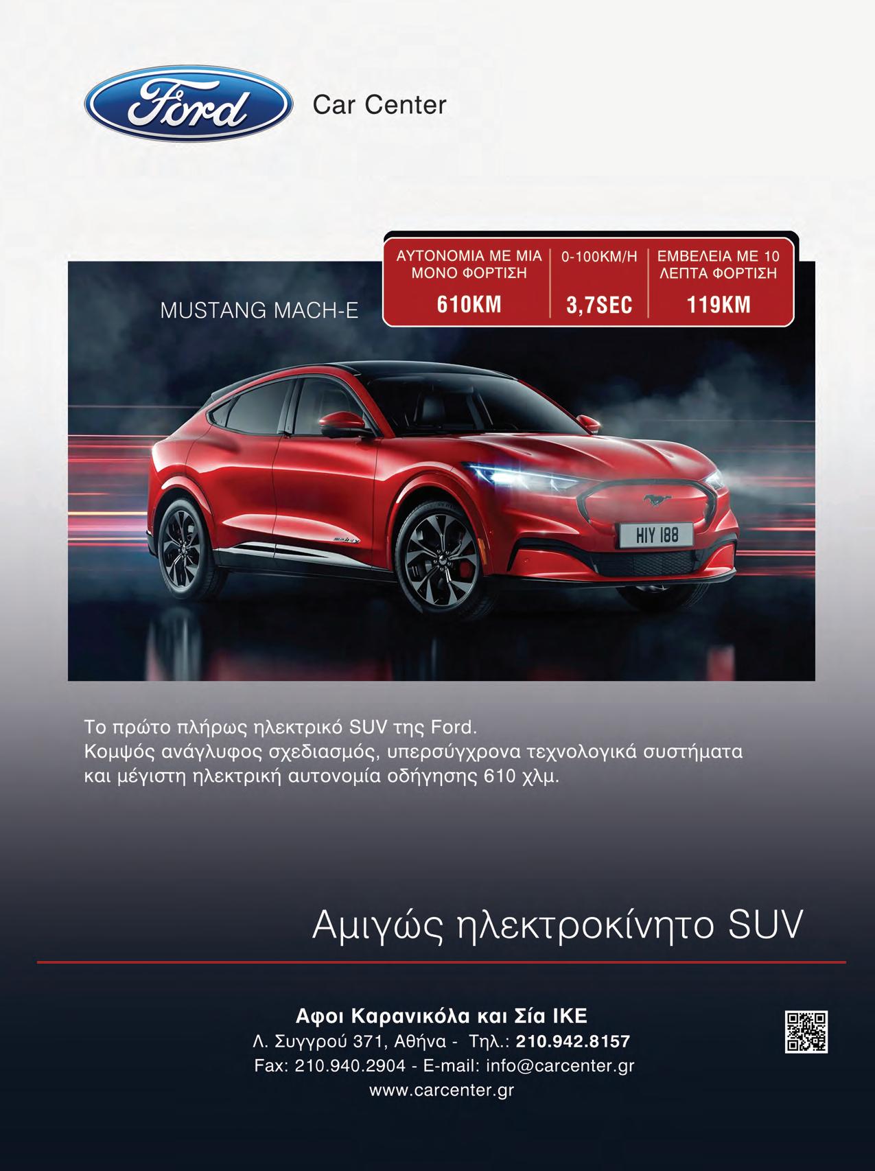Ο ι εισαγωγές όταν μιλάς για τη νέα Ford Mustang είναι πε ριττές. H νέα γενιά του θρυλι κού αυτοκινήτου φέρνει πλήθος νέ ων συστημάτων. Ως αποκορύφωμα είναι η δυνατότητα να βάλεις μπρο στά τον V8 από μακριά. Ξεκινώντας από το εξωτερικό, η νέα Mustang έρχεται με ανανεωμένο στυλ. Οι προβολείς Tri-Bar LED είναι το βασι κό χαρακτηριστικό, όπως και τα φαρ δύτερα πίσω φτερά που δίνουν μία πιο μυώδη εικόνα. Για μια ακόμα φο ρά υπάρχουν κάμπριο και κουπέ εκ δόσεις, με τη δεύτερη να έχει μεγαλύ τερη γραμμή οροφής, που η Ford λέει ότι δημιουργήθηκε για να διευκολύνει την είσοδο και την έξοδο. Από κει και πέρα σχεδιαστικές διαφορές υπάρχουν και ανάλογα τον κινητήρα (EcoBoost 2,3 λτρ. ή 5,0 λίτρων GT) που «φορά ει» η Mustang. Στην GT έκδοση με τον V8 η Mustang έχει διαφορετική σχεδί αση στο μπροστινό μέρος, με το επάνω τμήμα να χωρίζεται σε τρία κομμάτια και τους αεραγωγούς χαμηλά να διευρύνο νται. Επιπλέον αεραγωγούς θα βρει κά ποιος στο καπό, όπως και έναν επανα σχεδιασμένο σπλίτερ. Αμφότερα τα μοντέλα θα είναι εξοπλισμένα με το πακέτο Bronze Design που φέρει ζάντες και χάλκι να σήματα, ενώ υπάρχει και το πα κέτο Performance που μεταξύ άλ λων ενσωματώνει φρένα Brembo και φαρδύτερους πίσω τροχούς και ελαστικά. Τα αυτοκίνητα με το Performance Pack μπορούν να δι ατεθούν περαιτέρω με προσαρ μοζόμενα αμορτισέρ MagneRide, καθίσματα Recaro και ενεργή εξά τμιση. Η νέα Mustang GT με το Performance Pack εξοπλίζεται επί σης με ένα σύστημα που ονομάζε ται electronic drift brake και μοιά ζει με ένα παραδοσιακό μηχανικό χειρόφρενο, το οποίο σύμφωνα με τη Ford «είναι σχεδιασμένο για αρ χάριους οδηγούς να μαθαίνουν και να βελτιώνουν τις δεξιότητές τους στο drift, παρέχοντας επίσης στους έμπειρους οδηγούς ένα σύστημα έτοιμο για αγώνες». Η ολοκαίνουργια Mustang λαν σάρεται με 12 χρωματικές επιλογές, συμπεριλαμβανομένων των τρι ών νέων αποχρώσεων BlueEmber, VaporBlue και YellowSplash. Αλλαγμένη πλήρως η καμπίνα Στην καμπίνα της νέας Mustang λαμβάνουν χώρα κάποιες από τις με γαλύτερες αλλαγές. Ένας ψηφιακός πίνακας οργάνων 12,4 ιντσών και μία νέα οθόνη αφής 13,2 ιντσών για το σύστημα ψυχαγωγίας και ενημέ ρωσης SYNC 4 που ενσωματώνει και το Amazon Alexa είναι τα δύο βασι κά χαρακτηριστικά. Η γενική εικόνα στην καμπίνα της Mustang ξεφεύγει από τη ρετρό εμφάνιση των προη γούμενων γενεών, με το αυτοκίνητο να λαμβάνει τιμόνι με επίπεδη βάση, βάση ασύρματης φόρτισης τηλεφώ νου και μία πλήρη σουίτα συστημά των ασφαλείας. Δεν αλλάζουν τα μοτέρ Στους κινητήρες τα πράγματα δεν είναι πολύ διαφορετικά. Η νέα Mustang θα προσφέρεται είτε με τον EcoBoost 2,3 λίτρων είτε με το 5,0 λίτρων V8 μοτέρ. Η εταιρεία δεν έδωσε στη δημοσιότητα την ισχύ που αποδίδουν, ωστόσο σε αμφό τερες τις περιπτώσεις περιμένου με περισσότερους ίππους από τους 320 και 460 ίππους της σημερινής γενιάς. Στα κιβώτια ταχυτήτων οι επιλογές είναι είτε το 6τάχυτο μηχα νικό, είτε το αυτόματο 10 σχέσεων. 8 ΝΕΑ ΔΙΕΘΝΗ Nέα Ford Mustang: Αναβαθμισμένο στυλ και πιο hi-tech από ποτέ Πρεμιέρα έκανε η 7η γενιά της Ford Mustang, με το θρυλικό «pony» να έρχεται με ισχύ από V8 μοτέρ, τεχνολογίες αιχμής και ένα ολοκληρωτικά επανασχεδιασμένο σύστημα ψυχαγωγίας και ενημέρωσης. Η νέα Mustang εξοπλίζεται στη βάση της με ζάντες 17 ιντσών, ενώ η GT με 19άρες ζάντες, την ώρα που υπάρχουν ως επιλογή και οι 20άρες ζάντες. Τα υφασμάτινα καθίσματα είναι στάνταρ, με τα premium μοντέλα να αποκτούν ραφές αντίθεσης στον πίνακα οργάνων και στα εσωτερικά πάνελ των θυρών, ενώ τα μοντέλα GT διαθέτουν δερμάτινα ένθετα καθισμάτων. Στο 