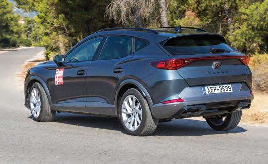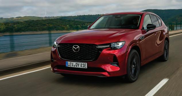 ζουν υφάσματα εμπνευσμένα από την ιαπωνική παράδοση με ανοιχτό χρωμο ξύλο και ακριβό δέρμα δίνο ντας μου τη δυνατότητα να ισχυρι στώ ξανά πως η Mazda είναι η πιο premium ιαπωνική φίρμα. Καλά, μη βαράτε. Αντικειμενικά, ο χώρος της καμπίνας είναι αρκετός και σίγουρα όποιος μπει στο εσωτερικό του CX60 δεν θα νιώσει ίχνος κλειστοφοβί ας. Υπάρχουν πολλές πρακτικές θή κες, αλλά και λύσεις, όπως η πρίζα των 230V στον μεγάλο χώρο απο σκευών (570 λτ.). Επιταχύνει δυναμικά και καίει σα σκούτερ Το plug-in υβριδικό σύστημα κί νησης αποτελείται από έναν ατμο σφαιρικό, τετρακύλινδρο βενζινο κινητήρα 2,5 λίτρων με 191 ίππους και υψηλή σχέση συμπίεσης (13:1). Πάνω του έχει «κουμπώσει» ένα ηλεκτρικό μοτέρ 175 ίππων, ένα ολοκαίνουργιο αυτόματο κιβώτιο οκτώ σχέσεων με πολύδισκο συ μπλέκτη χωρίς τον κλασσικό μετα τροπέα ροπής –χωρίς φυσικά την αίσθηση ολίσθησης ή τις σχετικές απώλειες- και μια μπαταρία ιόντων λιθίου 17,8 kWh. Η συνολική από δοση είναι 328 ίπποι και 500Νm ροπής, με την τετρακίνηση να είναι ηλεκτρονικά ελεγχόμενη μέσω ενός πολύδισκου συμπλέκτη: Σε κανονι κές συνθήκες η κίνηση πάει 90% πί σω και από εκεί και πέρα ανάλογα με τις συνθήκες μπορεί να μοιραστεί 50:50 εμπρός-πίσω. Η Mazda υπό σχεται ηλεκτρική αυτονομία 63 χι λιόμετρα, κάτι που αποδείχτηκε και σε πραγματικές συνθήκες. Το ίδιο και η δυναμική επιτάχυνση. Οι 328 συνδυαστικοί ίπποι του συστήματος γίνονται αισθητοί στο πάτημα του γκαζιού (0-100 σε 5,8 δλ. υπόσχεται η Mazda), ενώ ο ήχος είναι επίσης αρκετά «πικάντικος» θυμίζοντας 6 κύλινδρο σε σειρά και όχι 4κύλιν δρο σύνολο. Mε απόθεμα μπαταρία μέχρι τα 100 χλμ./ώρα κινείσαι ηλε κτρικά και η κατανάλωση είναι μη δενική. Αλλά και όταν άδειασε και το σύνολο δούλευε σαν αυτοφορτι ζόμενο υβριδικό η κατανάλωση δεν ξεπέρασε τα 3,5 λτ./100 χλμ. σε βόμενοι βέβαια πάντα τα όρια τα χύτητας στις αστικές περιοχές, αλ λά και ξεδίνοντας που και που στην autobahn! Άνετο, σταθερό και πειστικό στο δρόμο