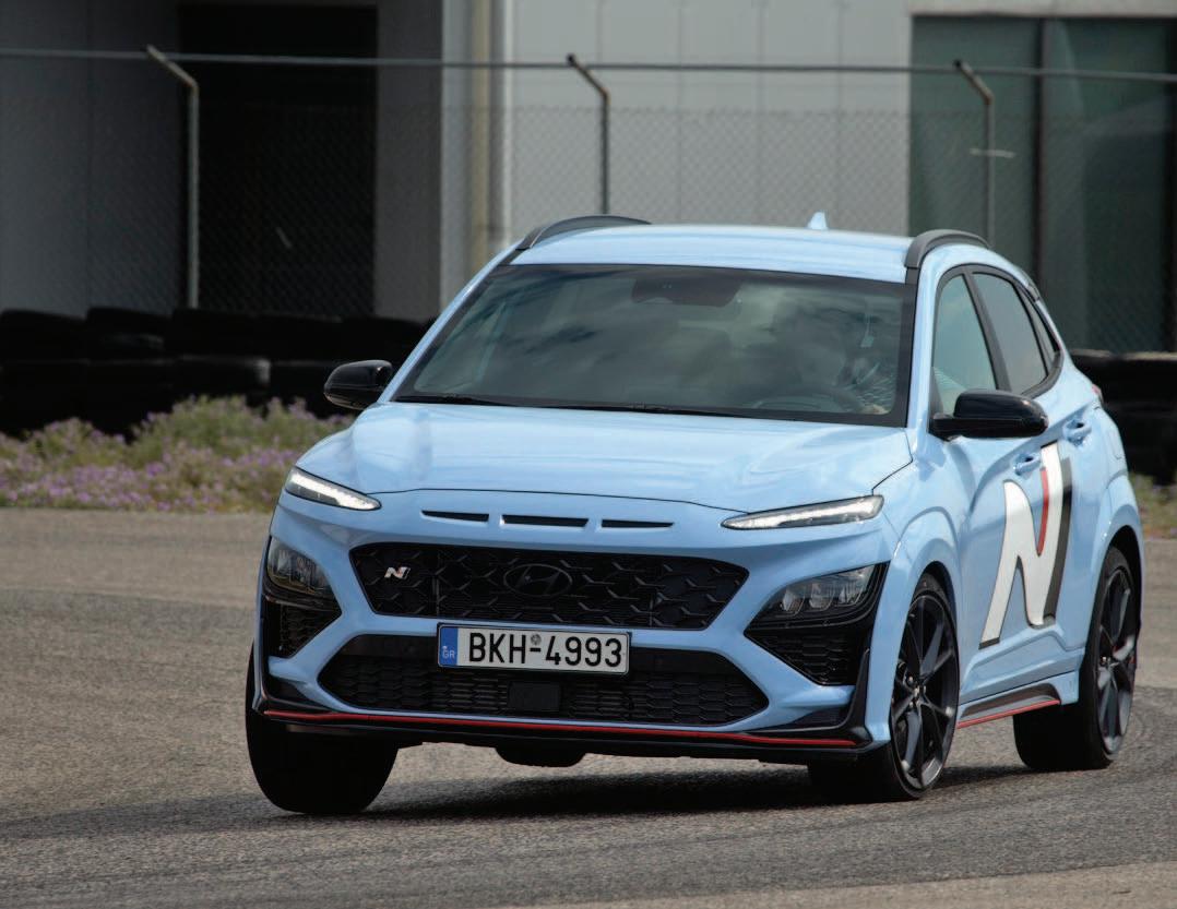 Δεν είναι τυχαίος ο τίτλος του «ισχυρότερου προσθιοκίνητου BSUV στον κόσμο» που συνοδεύ ει το Hyundai Kona N, για αυτό και οι εκρηκτικές επιδόσεις από τους 280 ίππους του 2λιτρου 4κύλιν δρου μοτέρ που προέρχεται από το i30 N. Σε αυτό συμβάλλει και η αμεσότητα του 8-τάχυτου διπλοσύ μπλεκτου κιβωτίου, που ειδικά στις ρεπρίζ για τις προσπεράσεις σε βο ηθά να φεύγεις... αέρα. Στην βασι κή μέτρηση επιτάχυνσης το Kona N υπερτερεί κατά 0,8 δλ., φτάνοντας από στάση τα 100 χλμ./ώρα σε μό λις 6,1 δλ.. Κατά τα άλλα, το κορε ατικό SUV πόλης έχει και πρόσθε τα καλούδια που αναβαθμίζουν την αγωνιστική του λίμπιντο. Πατώντας