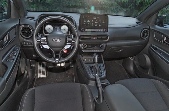 για τα «Ν» μοντέλα. Στο σύ νολό του το Kona N είναι πιο πρησμέ νο με τους σπορ προφυλακτήρες και τις μεγάλες εισαγωγές, τον πίσω δια χύτη, τις δύο θεόρατες μπούκες εξα τμίσεων και την πίσω αεροτομή, τις κόκκινες γραμμές χαμηλά στα sike skirts και τις κόκκινες δαγκάνες για τα τεράστια δισκόφρενα. Και στα δύο μο ντέλα υπάρχουν 19άρες ζάντες αλου μινίου, αρέσει αρκετά ο σφυρήλατος χαρακτήρας σε εκείνες του Kona N. Εσωτερικό: Digital καμπίνα & bucket καθίσματα, τιμόνι με... σπορ πληκτρο λόγιο στο