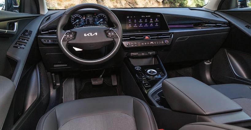 που ενοποιεί τις δύο καμπύλες οθό νες 10,25 ιντσών, οι οποίες απεικο νίζουν τον πίνακα οργάνων και τις λειτουργίες του infotainment. Το τε χνολογικό υπόβαθρο του Niro εκ φράζεται επίσης και μέσω της κον σόλας διπλής λειτουργίας, κάτω από τους κεντρικούς αεραγωγούς, που με το πάτημα ενός μπουτόν αφής μετατρέπεται από μενού πε ριφερειακών λειτουργιών (πλοήγη ση, πολυμέσα,