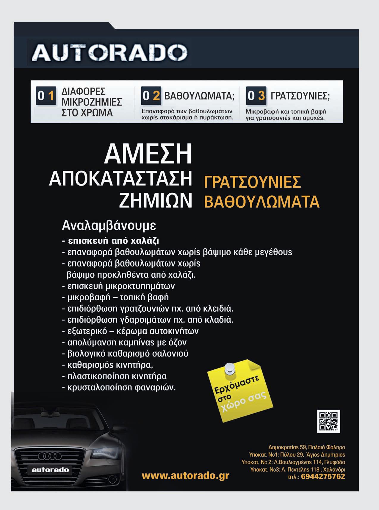 βρώμικα κλπ) Προκαλείται περισσό τερη φθορά, παρά καθαριότητα. Η απλούστερη συντήρηση είναι το κέρωμα Πρέπει να «κερώνεις» το όχημα σου τουλάχιστον δύο με τρεις φορές τον χρόνο. Με πολύ προσεχτική χρή ση μπορείς να το προστατεύσεις ως ένα βαθμό για μερικούς μήνες. Το κόστος εφαρμογής είναι ανάλο γο με το μέγεθος του οχήματος και την μάρκα κεριού που θα χρησιμο ποιήσει ο επαγγελματίας. Δεν συνί σταται να γυαλίζεις το όχημα σου πε ρισσότερο από 3 φορές κατά μέσο όρο σε μια δεκαετία. Κέρωμα μπο ρείς να κάνεις όσες φορές θέλεις. Πώς μπορεί να σε βοηθήσει ένα φανοποιείο! Ορισμένα φανοποιεία έχουν τη δυνατότητα να σου προσφέρουν τις παρακάτω ευκολίες: - Απευθείας είσπραξη από τις ασφαλιστικές εταιρείες Σε περίπτωση τρακαρίσματος για το οποίο δεν ευθύνεσαι, πολλά φα νοποιεία αναλαμβάνουν τη διαδικα σία πληρωμής