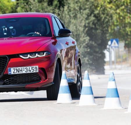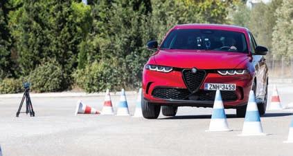 Alfa Romeo Tonale Η Alfa Romeo Tonale ήρθε σχεδιασμένη από τα χέρια του Έλληνα Αλέξανδρου Λιώκη για να αποτελέσει μια νέα premium και σπορτίφ πρόταση στην κατηγορία των μικρομεσαίων οικο γενειακών SUV (C-SUV). Πως στρίβει όμως; Υπάρ χει οδηγικό ζουμί πίσω από την ελκυστική εμφάνι ση; Τιμά το όνομα της Alfa Romeo και την ιταλική καταγωγή της; Για τις σχετικές απαντήσεις η Tonale υποβλήθηκε στη δοκιμασία της αποφυγής κινδύνου (ELK TEST) και τι καλύτερος τρόπος να εγκαινιάσουμε τη νέα πί στα εκτέλεσης του ELK, στον πιστοποιημένο χώρο της σχολής ασφαλούς οδήγησης «Driving Academy», δί πλα από τον Ιππόδρομο στο Μαρκόπουλο Αττικής. Το μοντέλο που δοκιμάσαμε ήταν η ήπια υβριδική Tonale με τον «καλό» 1,5 turbo κινητήρα των 160 ίππων που συνδυάζεται αποκλειστικά με αυτόμα το κιβώτιο διπλού συμπλέκτη 7 σχέσεων. Η έκδοση εξοπλισμού ήταν η Speciale, όπου είναι στάνταρ οι τροχοί των 20 ιντσών με ελαστικά 235/40. Όπως σε κάθε αντίστοιχη περίπτωση επιλέχθηκε το Dynamic πρόγραμμα λειτουργίας. 78,5 χλμ./ώρα Το ουδέτερο κράτημα, η αμεσότητα του τιμονιού και η σωστή λειτουργία του ESP αποτελούν τα στοιχεία που εξασφάλισαν στην Alfa Romeo Tonale μια κορυφαία επίδοση. Επίδοση για να παραμιλάς Η Tonale είναι το πρώτο C-SUV της Alfa Romeo και κατάφερε μια εντυπωσιακή επίδοση στην απαιτητική δοκιμή αποφυγής κινδύνου, που μόνο το AutoΤρίτη TEST CEΝΤΕR πραγματοποιεί στην Ελλάδα. Γενική αίσθηση οδηγού: Aν και η ελαφριά αίσθηση του τιμονιού δεν εμπνέ ει αρχικά, το αποτέλεσμα και η μηχανική αίσθηση της Tonale έδειξαν πως και ακό μα και σε SUV μια Alfa Romeo στρίβει πειστικά! Γενική αίσθηση επιβατών: Ποτέ δεν νιώσαμε άγχος ή ανασφάλεια ακόμη και στις προσπάθειες πάνω από το όριο του αυτοκινήτου.. Μας έλειψαν πίσω χειρο λαβές. Η νέα Αlfa Romeo Tonale στη δοκιμή αποφυγής κινδύνου (ELK TEST)TEST CENTER 70