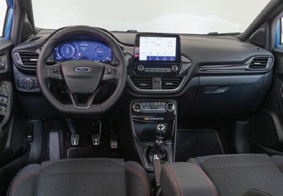 περισσότερο το σχήμα αυτό. Πιο ευρύχωρο το Puma με σχεδόν διπλάσιο πορτ-μπαγκάζ Η σχεδίαση της καμπίνας είναι σχεδόν ίδια, που σημαίνει πως και τα δύο μοντέλα προσφέρουν νεανι κό διάκοσμο, πλούσιο στάνταρ εξο πλισμό άνεσης και ασφάλειας, στά νταρ οθόνη αφής 8 ιντσών, αλλά και στάνταρ ψηφιακό πίνακα οργάνων 12,3 ιντσών. Μεγάλο πλεονέκτη μα του Puma είναι φυσικά ο χώρος αποσκευών των 458 λτ. συν άλ λα 80 λτ. του MegaBox (μπορεί να πλυθεί και να αποστραγγισθεί), ένα ντι 311 λτ. του Fiesta, ενώ ο οδηγός θα εκτιμήσει την υψηλότερη θέση οδήγησης που κάνει παιχνιδάκι την κίνηση μέσα στην πόλη. Επιπλέον, λόγω μεγαλύτερης απόστασης από το έδαφος η επι/αποβίβαση είναι πιο εύκολη στο Puma, ενώ υπάρχει και το αίσθημα μεγαλύτερης ευρυχωρί ας στην καμπίνα, λόγω μεγαλύτερου ύψους. Κινητήρας: Τραβάει υποδειγματικά ο ήπια υβριδικός Puma ή Fiesta στα 125 PS; H καμπίνα του Fiesta είναι γεροδεμένη, εργονομική και πλήρως εξοπλισμένη. Η έκδοση ST-Line χαρακτηρίζεται από τις σπορτίφ λεπτομέρειες και τα «ανθρακονημάτινα» στοιχεία στο ταμπλό. Σε μια στριφτερή διαδρομή με το Fiesta «ακουμπάς» στο κορυφαίο πλαίσιο, απολαμβάνεις τιμόνι, φρενάρεις δυναμικά και στρίβεις εντελώς ουδέτερα. Έκδοση ST-Line Τιμή από (ευρώ) 21.630 ESP l Σύστημα Αυτόματου Φρεναρίσματος l Αερόσακοι 6 Ηλ. παράθυρα Ε/Π l/l Κεντρικό κλείδωμα/Τλχ. l/l Ηλεκτρικοί καθρέπτες/Αναδ. l/m Υποβοήση/ Ρύθμιση τιμονιού l/l Κλιματισμός l (Clima) Ηχοσύστημα/Οθόνη l/έγχρωμη 8’’ Cruise control l Ζάντες αλουμινίου l 17 ιντσών Προβολείς ομίχλης m Φώτα ημέρας LED l: στάνταρ, m: προαιρετικός, -: δε διατίθεται Εξοπλισμός - τιμή Εμπρός ανάρτηση Γόνατα ΜακΦέρσον Πίσω ανάρτηση Ημιάκαμπτος άξονας, αντιστρεπτική Εμπρός φρένα Αερ. Δίσκοι 262 χλστ. Πίσω φρένα Ταμπούρα 100-0 χλμ./ώρα (μ.) 38,5 Υποβοήθηση τιμονιού Ηλεκτρική Μετατρόχιο Ε/Π (χλστ.) 1.513/1.476 Στροφές τιμονιού 2,5 Κύκλος στροφής (μ.) 10 Θόρυβος στα 100/ 67,5/69,1 120 χλμ./ώρα με 5η/6η (db) Διάσταση ελαστικών δοκιμής 205/45 R 17 Αναρτήσεις-Φρένα-Τιμόνι Κυβισμός (κ.εκ.) 999 Κύλινδροι/Βαλβίδες 3/12 Τροφοδοσία Άμεσος ψεκασμός +turbo, mild hybrid Ισχύς (ίπποι/σ.α.λ.) 125/6.000 Ροπή (Nm/σ.α.λ.) 170/1.400-4.500 (210/1.750 με overboost) Start/Stop ΝΑΙ Βάρος με οδηγό (κιλά)* 1.211 Κινητήρας* Μέση εργοστασιακή 5 Μέση δοκιμής 6,3 Ρεζερβουάρ (λτ.) 42 *Εργοστασιακές μετρήσεις Εκπομπές CO2 (γρ./χλμ.)* 113 Τεχνικά χαρακτηριστικά Ford Fiesta 1,0 EcoBoost 125 PS mHEV Eπιδόσεις 200 5,0 Τελική ταχύτητα (χλμ./ώρα) Κατανάλωση (λτ./100 χλμ.) 60-100 χλμ./ώρα με 4η/5η (δλ.) 7,2/9,7 80-120 χλμ./ώρα με 5η/6η (δλ.) 10,0/13,4 VS Ford Fiesta 1,0 Ecoboost mHEV 125 PS VS Ford Puma 1,0 Ecoboost mHEV 125 PS 62