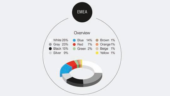 νία αντιμετώπισε πρωτόγνω ρες προκλήσεις. Υπήρξε σημα ντική μείωση στα αυτοκίνητα που κατασκευάστηκαν το 2020 και το 2021 σε σχέση με τα προηγούμε να χρόνια. Το γεγονός αυτό απει κονίζεται ξεκάθαρα στην έκθεση BASF Color Report για το 2021, που αφορά στις εργοστασιακές βα φές αυτοκινήτων. Κάποιες συγκε κριμένες χρωματικές αποχρώσεις αναδεικνύονται, ενώ κάποιες δια χρονικές επιλογές επηρεάστηκαν κάπως αρνητικά. Τα αχρωματικά χρώματα – λευ κό, μαύρο, γκρι και ασημί – εξακο λουθούν να είναι τα δημοφιλέστε ρα. Διαθέτουν κλασική, διαχρονική ομορφιά και συνδέονται τόσο με το περιβάλλον όσο και με την υψη λή τεχνολογία. Καθώς όμως εμφα νίζονται νέοι χρωματικοί τόποι, τα χρώματα αυτά αρχίζουν να χάνουν τη δημοφιλία τους. Όπως προέβλεψαν οι σχεδια στές της BASF πριν από χρόνια, το μπλε αρχίζει να κερδίζει έδαφος. Το ίδιο συμβαίνει και με το κόκκινο – που αρχίζει να κερδίζει μερίδιοα γοράς από τα αχρωματικά χρώματα σε πολλά μέρη του κόσμου. Αν και οι αριθμοί είναι μικρότεροι, το πρά σινο και το μπεζ εξακολουθούν να εμφανίζονται στα δεδομένα, και τα χρώματα δεν είναι στις συνηθισμέ νες, αναμενόμενες αποχρώσεις. Ευρώπη, Μέση Ανατολή και Αφρική (EMEA) –Μεγαλύτερη ποικιλία χρωμάτων & αποχρώσε ων Τα χρώματα σε Ευρώπη, Μέση Ανατολή και Αφρική (EMEA) απο