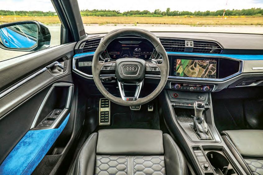 αυτό κοστίζει σε χρόνο. Αν θέλεις να πας γρήγορα, σταματάς να ντριφτάρεις, το διαφορικό στέλνει τη ροπή στον εξωτερικό τροχό και το Cupra βγαίνει από τη στροφή με ουδέτερη προς ελάχιστα υπερστροφι κή συμπεριφορά. Πίστα ή καθημερινότητα; Ακόμα και με 400 άλογα κάτω από το καπό του, το Audi RS Q3 παραμένει SUV στην καρδιά και την ψυχή: ο οδη γός κάθεται πιο ψηλά και όχι ακριβώς Δεν δανείζεται μόνο το μοτέρ: λογότυπο Audi RS πάνω στην εξάτμιση του Cupra. Cupra Formentor VZ Με δυο πολύδισκους συμπλέκτες, η ισχύς φτάνει ανεξάρτητα σε κάθε τροχό. TEXNIKA XAΡΑΚΤΗΡΙΣΤΙΚΑ AUDI CUPRA Κινητήρας Διάταξη/κύλινδροι πεντακύλινδρος, turbo πεντακύλινδρος, turbo Θέση εμπρός, εγκάρσια εμπρός, εγκάρσια Βαλβίδες/εκκεντροφόροι 20/2 20/2 Κυβισμός κ.εκ. 2.480 2.480 Ισχύς συστήματος PS 400 390 Ροπή συστήματος Nm 480 480 Τελική ταχύτητα km/h 225 220 Κιβώτιο/σχέσεις διπλού συμπλέκτη/7 διπλού συμπλέκτη/7 Μετάδοση στους τέσσερις τροχούς στους τέσσερις τροχούς Φρένα εμπρός/πίσω δίσκοι/δίσκοι δίσκοι/δίσκοι Ρύποι CO2 226 g/km 230 g/km Κατανάλωση (WLTP) 10 l/100 km 10,1 l/100 km Ρεζερβουάρ/καύσιμο 63 l/super αμόλυβδη 55 l/super αμόλυβδη Χώρος αποσκευών λίτρα 530-1.525 410-1.465 Ρυμουλκούμενο βάρος με φρένα/χωρίς φρένα 1.900/750 kg Διαστάσεις (Μ/Π/Υ) mm 4.506/1.851-1.984*/ 4.468/1.852-1.992*/ 1.602 1.505 Μήκος Μεταξονίου 2.681 mm 2.680 mm Επιδόσεις Τελική ταχύτητα km/h 250 (προαιρετικά 280) 250 Επιτάχυνση 0-50 km/h 1,8 δευτ. 1,6 δευτ. 0-100 km/h 4,5 δευτ. 3,9 δευτ. 0-130 km/h 6,8 δευτ. 5,9 δευτ. 0-160 km/h 9,9 δευτ. 8,8 δευτ. 0-180 km/h 15,7 δευτ. 14,3 δευτ. Ρεπρίζ 60-100 km/h 2,3 δευτ. 1,9 δευτ. 80-120 km/h 2,8 δευτ. 2,4 δευτ. Βάρος κενό 1.755 kg 1,645 kg Κατανομή βάρους εμπρός/πίσω 56/44% 58/42% Κύκλος στροφής αριστερά/δεξιά 11,8/11,8 m 11,3/11,3 m Ύψος καθίσματος 640 mm 560 mm Φρένα από τα 100 km/h κρύα m 34,2 33,9 από τα 100 km/h ζεστά m 33,8 33,7 από τα 200 km/h ζεστά m 133,3 132,1 Θόρυβος με 50 km/h 57 dB 58 dB με 100 km/h 65 dB 67 dB με 130 km/h 69 dB 69 dB Τιμή αρχικής έκδοσης 96.550 ευρώ 63.890 ευρώ 30 ΣΥΓΚΡΙΤΙΚΗ ΔΟΚΙΜΗ AUDI RS Q3 vs CUPRA FORMENTOR VZ5