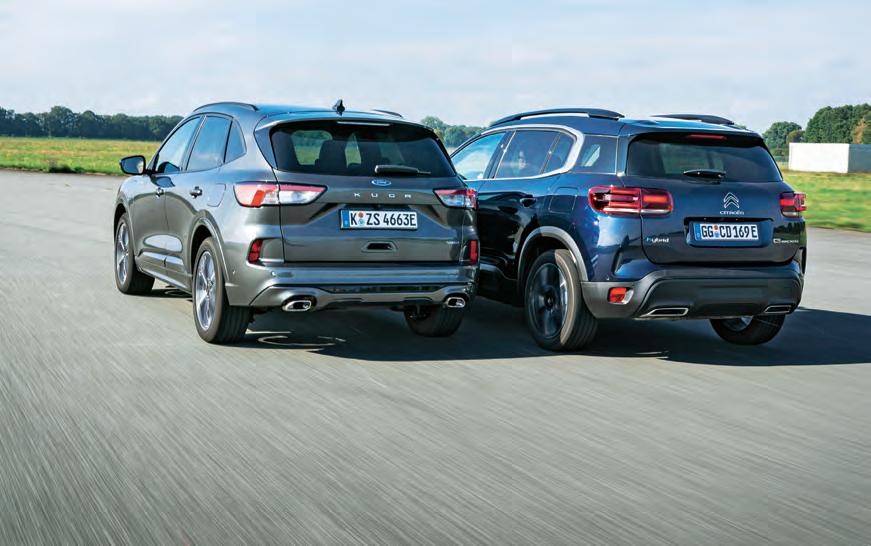 κούραστα και πολιτισμένα το αμάξωμα από πολύ χαμηλά, με το συνεχώς μετα βαλλόμενο κιβώτιο ταχυτήτων CVT να διαχειρίζεται και να ελίσσεται εξαιρετι κά μεταξύ των 2 κινητήρων. Οδηγικά, η σφιχτή ανάρτηση και το κάπως νευρικό τιμόνι ίσως χαλάσουν την ηρεμία των επιβατών, με την καλή ποιότητα κύλι σης και την ευθυβολία σε υψηλές τα χύτητες να ομορφαίνουν την εικόνα. Η γνώμη μας Η ανανέωση του C5 Aircross απέδωσε καρπούς και πλέον δείχνει να έχει αφήσει στο παρελθόν τις παιδικές αρρώστιες, όντας πιο ολοκληρωμένο και φυσικά να είναι βασιλιάς της άνε σης. Από την άλλη το Ford Kuga έχει εξαιρετικές δυνατότητες και δεν φα νερώνει σχεδόν καμία αδυναμία, ενώ έχει μεγάλη ηλεκτρική αυτονομία και χαμηλή κατανάλωση, τομέας με ιδιαί τερη βαρύτητα σε αυτήν την κατηγορία των plug-in. Ποιο από τα δύο; Η τελι κή κρίση θα επηρεαστεί από την τιμή, όταν επισημοποιηθεί αυτή του γαλλι κού μοντέλου. Τα δύο PHEV επιτυγχάνουν γρήγορες επιδόσεις και οικονομία με διαφορετικής φιλοσοφίας βενζινοκινητήρα κάτω από το καπό τους. ΚΑΤΑΤΑΞΗ * Citroen C5 Aircross Αρμονικό σύνολο, δυνατές επιδόσεις, καλή επιλογή υλικών, άνετη ανάρτηση. 1 Ford