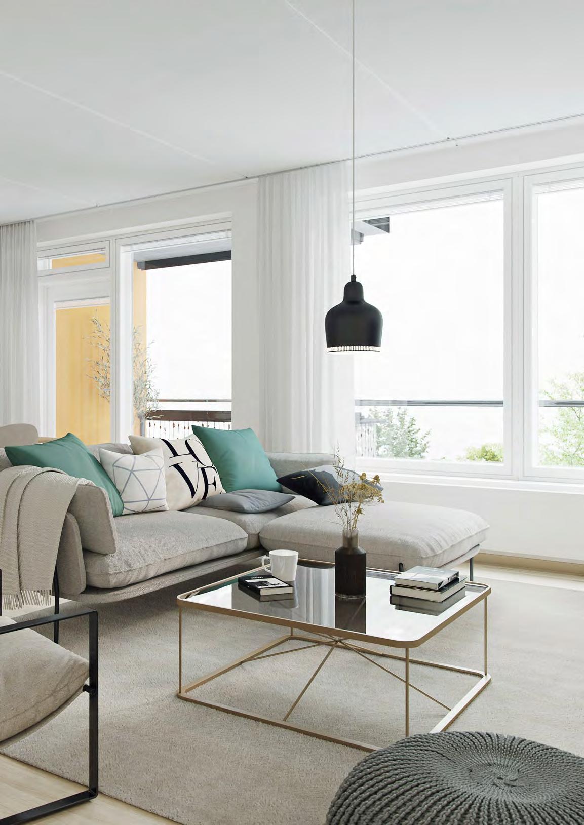 Suurista ikkunoista tulviva luonnonvalo ja avarat oleskelutilat luovat kodikkaan kokonaisuuden. Parvekkeet ovat lasitettuja ja tarjoavat viihtyisän lisätilan ympärivuotiseen käyttöön. Hyvin jäsennellyt säilytysratkaisut ja modernit kylpyhuoneet viimeistelevät asumismukavuuden.