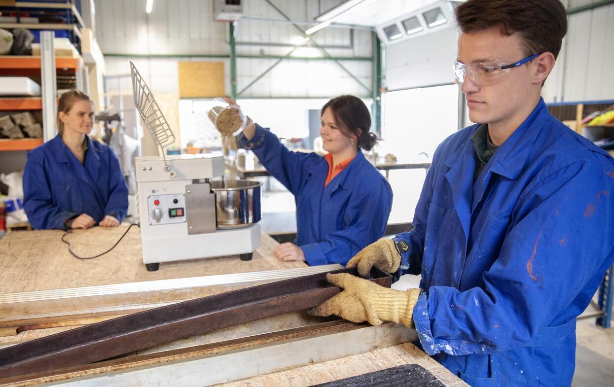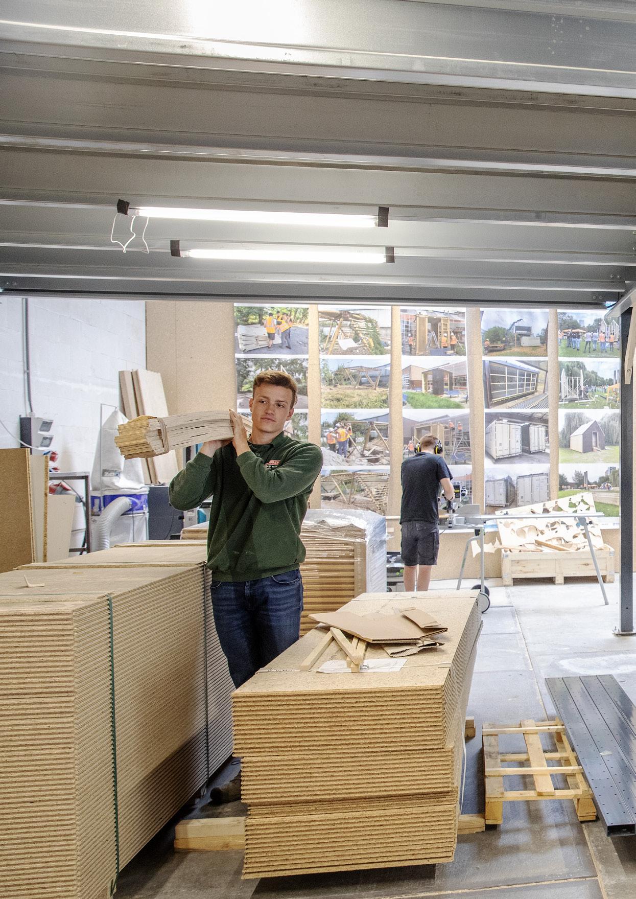 Verder bouwen in de praktijk Een volgende stap volgde op een aparte locatie, waar vanuit de Academie voor Duurzaam Gebouwde Omgeving (ADGO) van Avans Hogeschool ruimte werd geboden voor verdere praktijkgerichte materiaalontwikkeling. Die plek bood mogelijkheden om te experimenteren en te werken met materialen, maar naarmate de projecten groeiden, werd duidelijk dat er meer nodig was. De schaal van het werk veranderde. Waar eerder werd getest en ontwikkeld, ontstond de behoefte om ook grotere constructies te bouwen en complete onderdelen op ware grootte te realiseren.