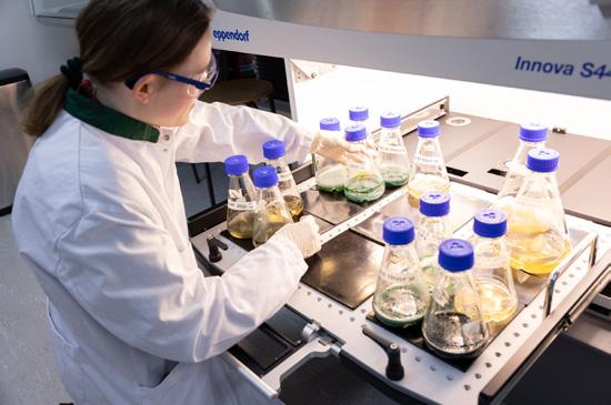 Onderzoekers van lectoraten zoals Biobased Building Blocks & Products, Smart Energy en Biobased Bouwen delen de ruimte en maken gebruik van dezelfde apparatuur: van fermentoren tot geavanceerde gaschromatografie.