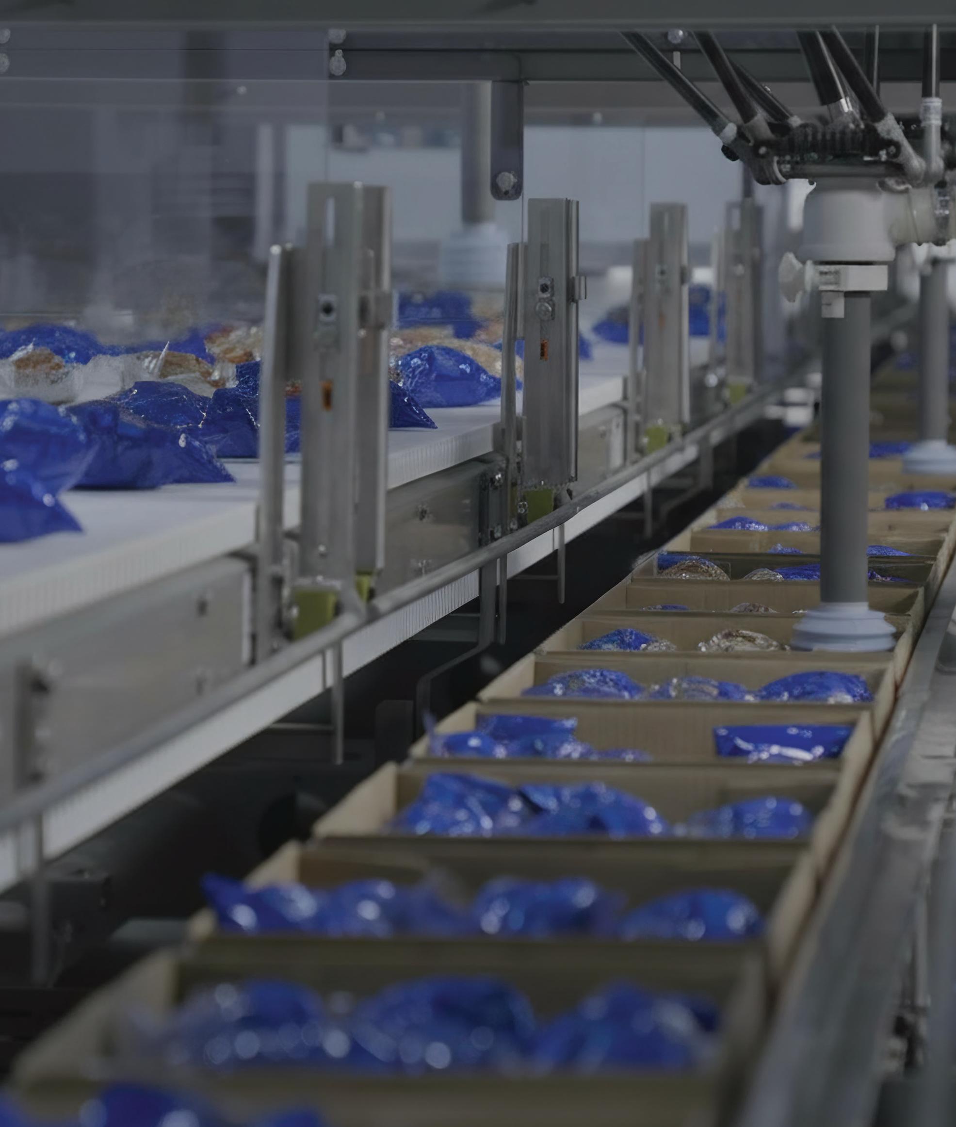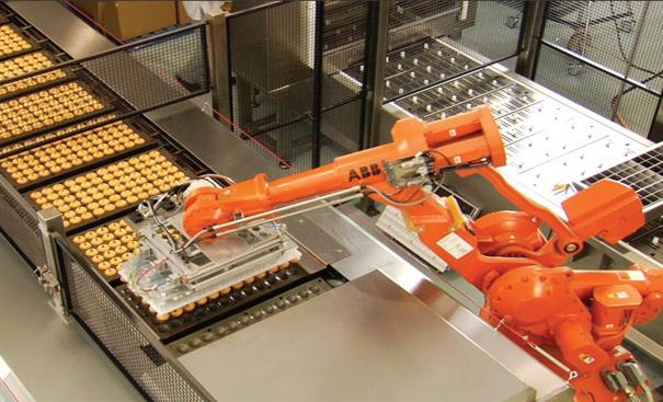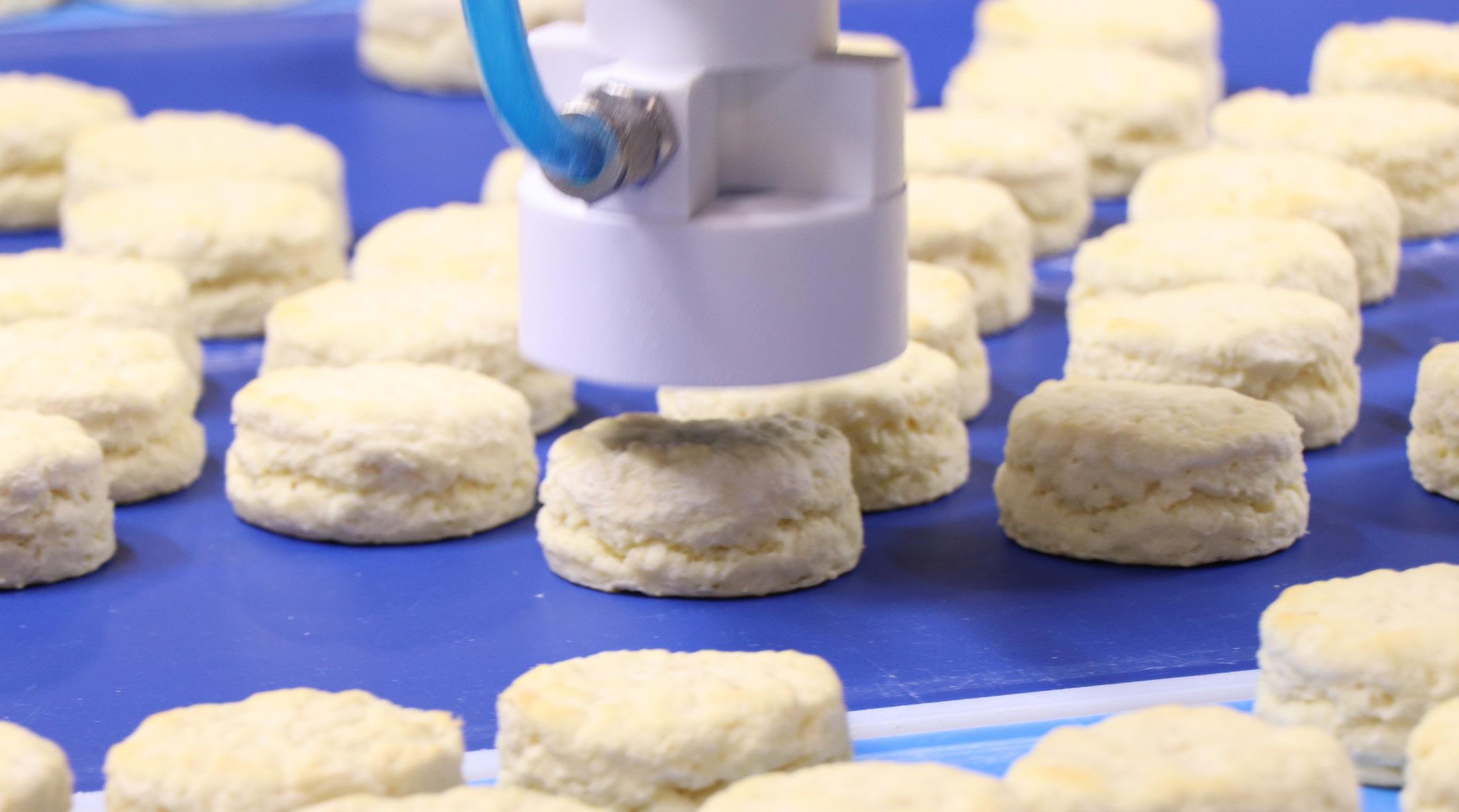 Downstream, an army of Staubli robots keeps pace with the high volume by organizing frozen biscuits into pre-configured stacks and rows for fast and efficient packaging.