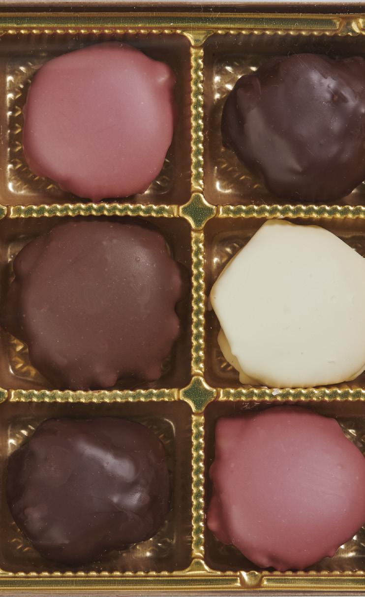 FILLED WITH JUMBO FANCY PECANS, CREAMY CARAMEL, AND SMOTHERED IN PURE WHITE, DARK, MILK AND NATURAL RUBY CHOCOLATE