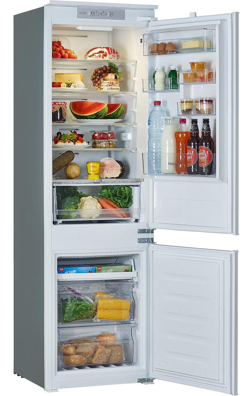 This Hotpoint integrated fridge freezer is a sleek and spacious addition to your kitchen. With a total capacity of 250 litres, five glass shelves, seven possible shelf positions, plus a drawer, there’s plenty of room. It has electronic humidity control to help keep fruit and veg fresh for longer.