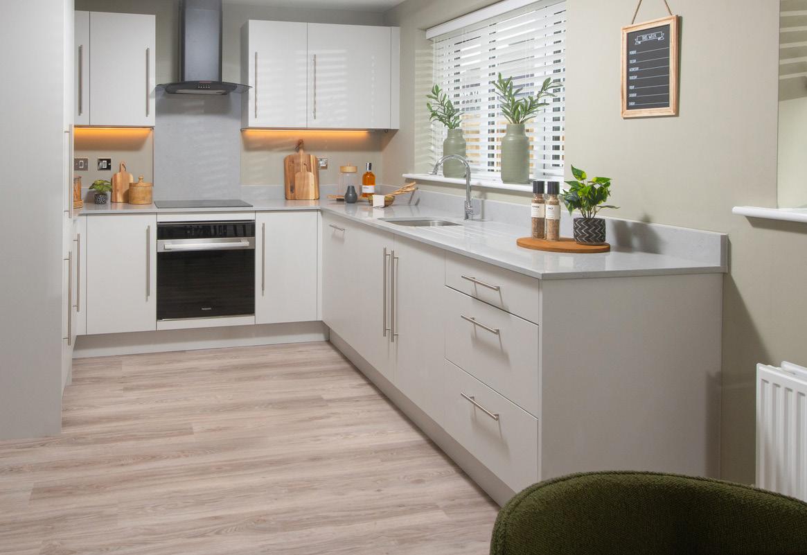 As standard, in your kitchen you will get to choose from a selection of matt finish, coloured kitchen cupboards. Or if you want to upgrade, you can choose from a wider selection!