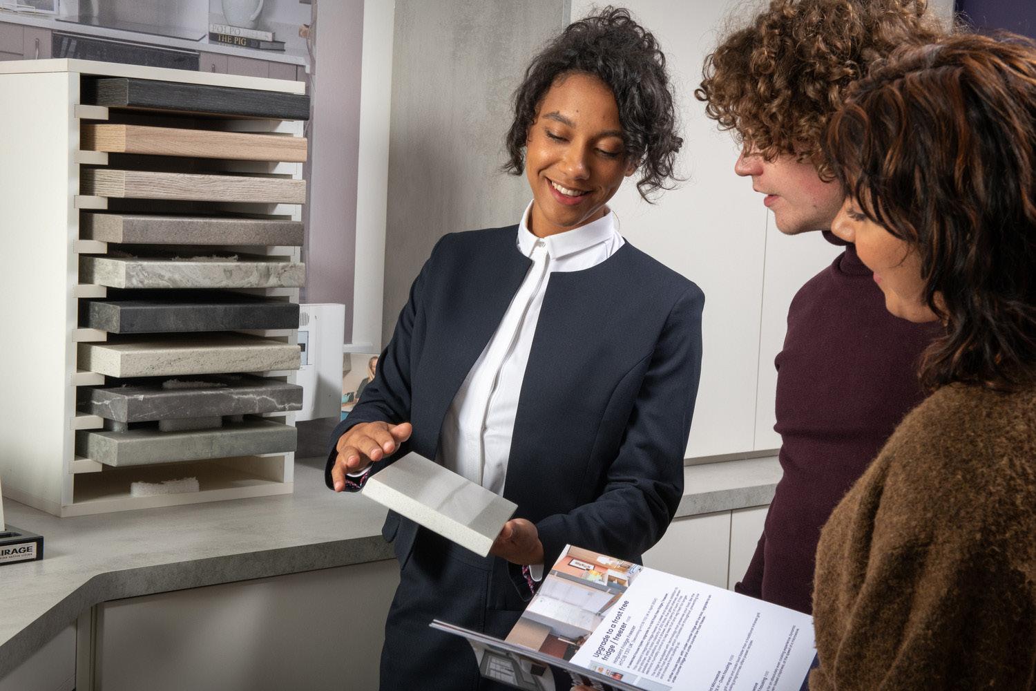 Take inspiration from our beautifully curated show homes and browse our selection of tiles, cupboard doors and worktop samples.