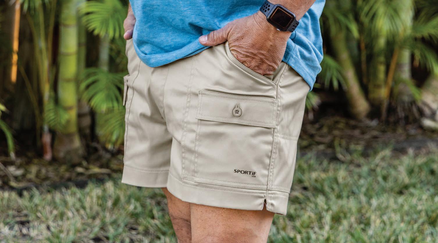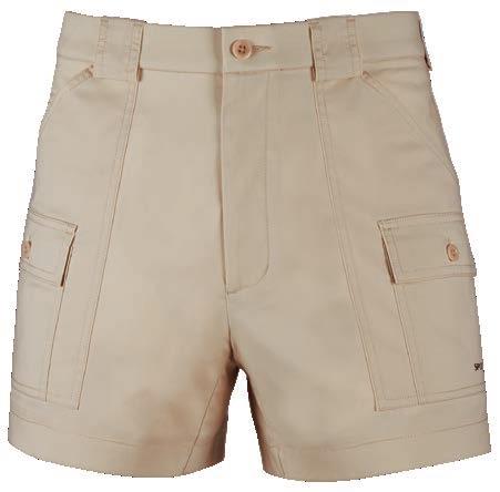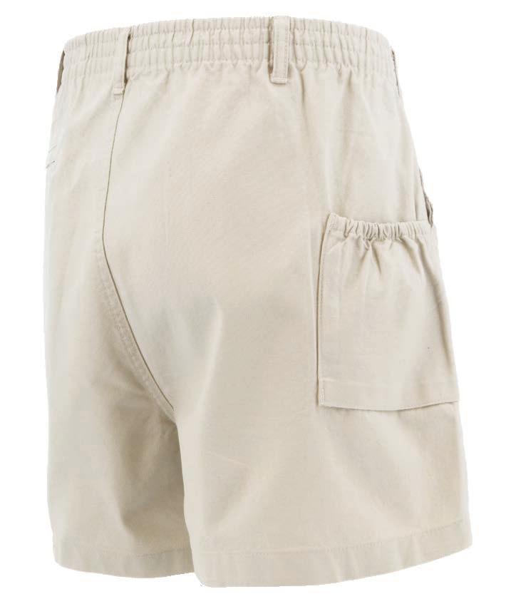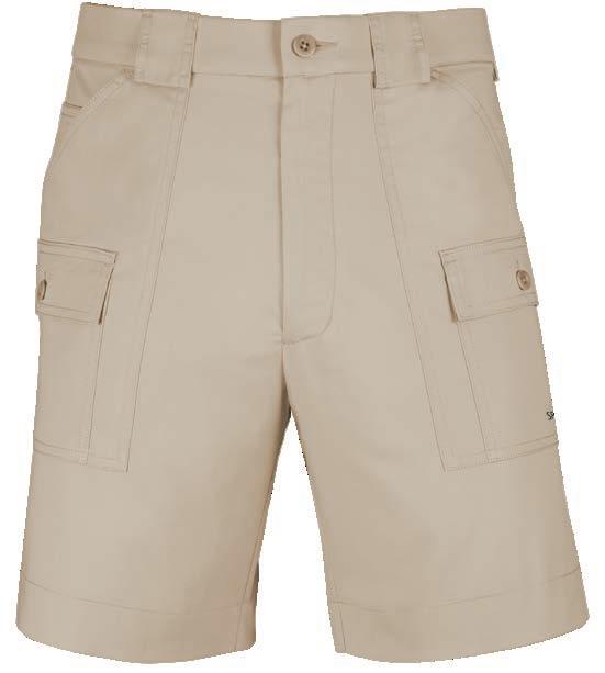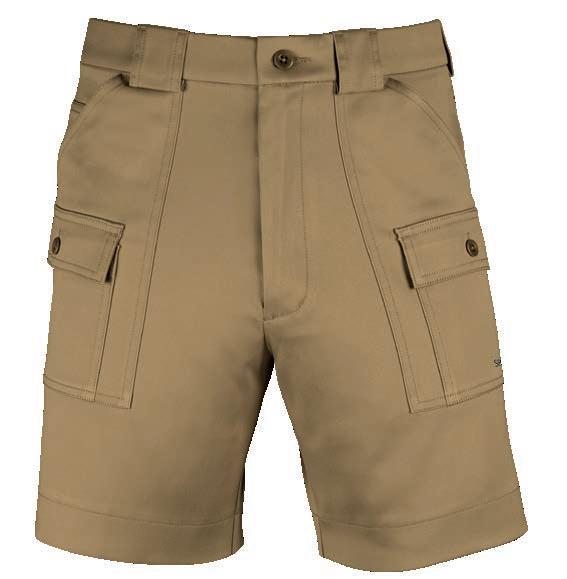 100% rugged cotton Camp Cloth in an 8” cargo style short. Features comfort side elastic waistband with handy D-ring, and pockets galore: deep expandable front pockets, front cargo flap pockets, beverage can/phone pocket, hidden security pocket and secure zip back pocket.
