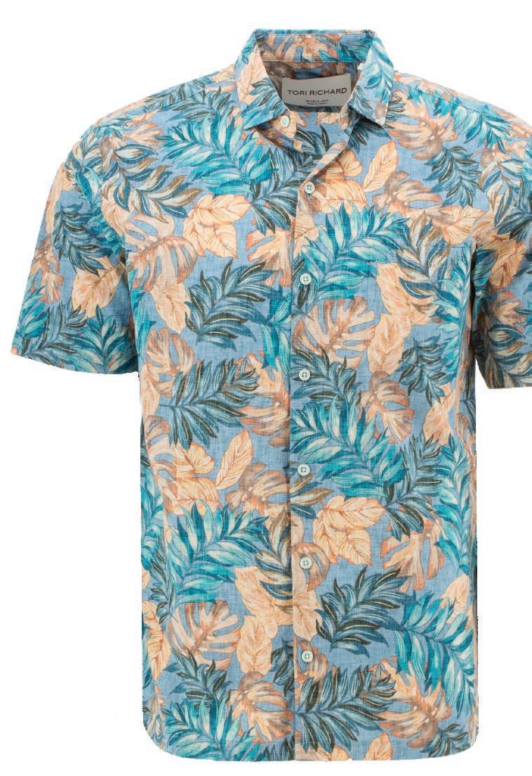 The cotton lawn fabric makes the Assemblage Print shirt by Tori Richard a standout. Cotton lawn has a high thread count, more so than the average fabric, giving this style a luxurious silky feel with the ease of cotton. This breathable fabric is sure to look structured but feel cool against the skin. The print evokes tropical foliage but in an elevated and modern way.