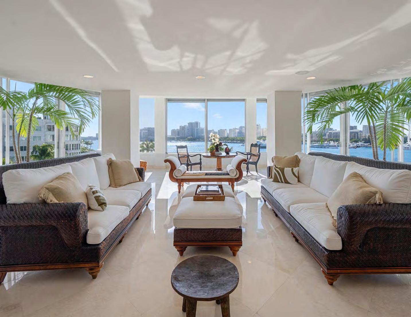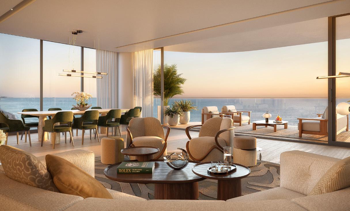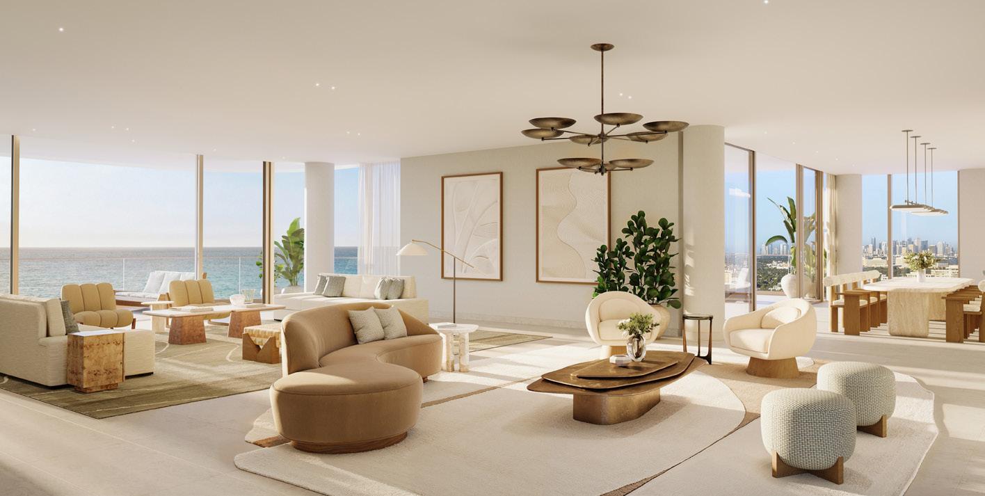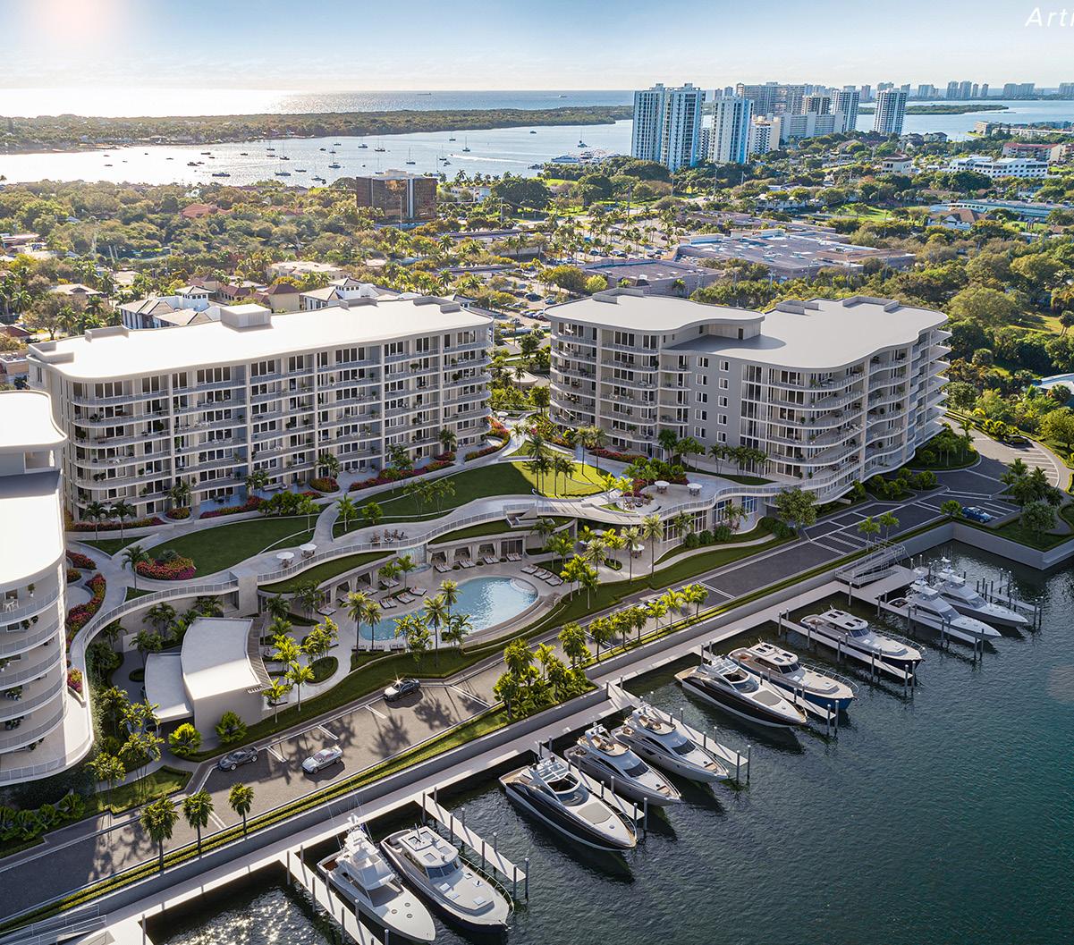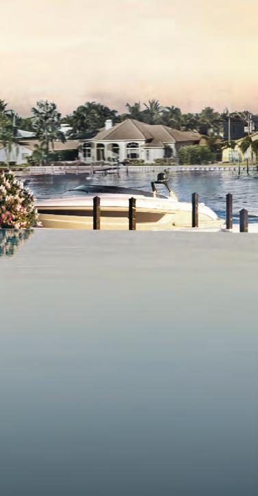 The estates range from three to five-bedrooms with a private den and expansive terraces overlooking over 1000 feet of the intercostal landscape. Each residence features entry vestibules, generous great rooms with open floor plans and and floorto-ceiling, triple panel, impact resistant glass doors and windows, and oversized porcelain tiles. Customizable designer kitchens are outfitted with professional-grade Wolf and Sub-Zero appliances. Guest bedrooms have walk-in closets and primary suites have double walk-in closets, direct access to waterfront terraces and glass enclosed showers and free-standing tubs.