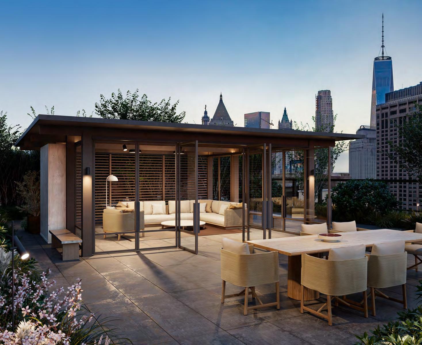 The sophisticated, well-attended lobby has wood ceilings, and the floors and walls are lined with honed stone and tile. A lounge is anchored by an elegant linear fireplace–the perfect space for coworking, relaxing, and entertaining. A secret garden nearby is the perfect escape for meditating and relaxing. The fully landscaped rooftop terrace has a fire pit and outdoor kitchen surrounded by breathtaking skyline views. There is also a fully equipped fitness center, children’s playroom, and bike storage.