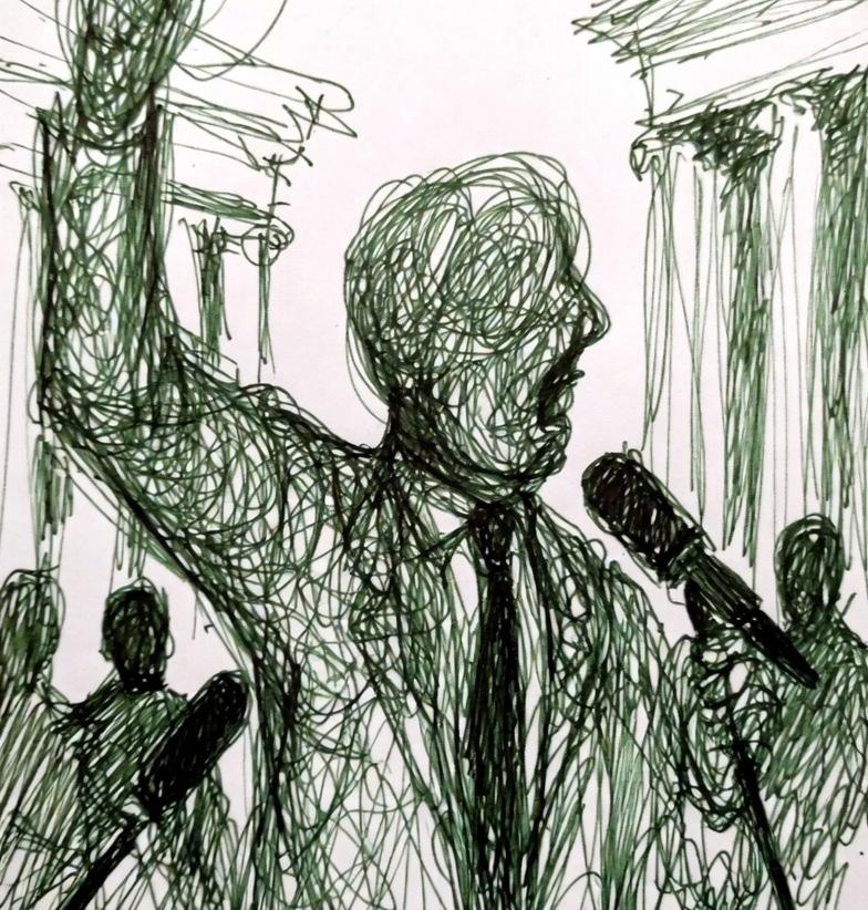 À l’issue de la dernière audience dans l’affaire dite « du complot contre la sûreté de l’Etat », le 5 avril 2025, Ahmed Souab s’exprime, aux côtés de ses confrères et de ses consœurs, devant le tribunal de première instance de Tunis. Il y dénonce une parodie de procès et l’absence d’indépendance de la justice dans une affaire hautement politique où sont jugés plusieurs opposants au régime de Kaïs Saïed. Au cours de sa déclaration, il mime un geste pour illustrer la situation du juge « le couteau sous la gorge », dénonçant les pressions politiques que la