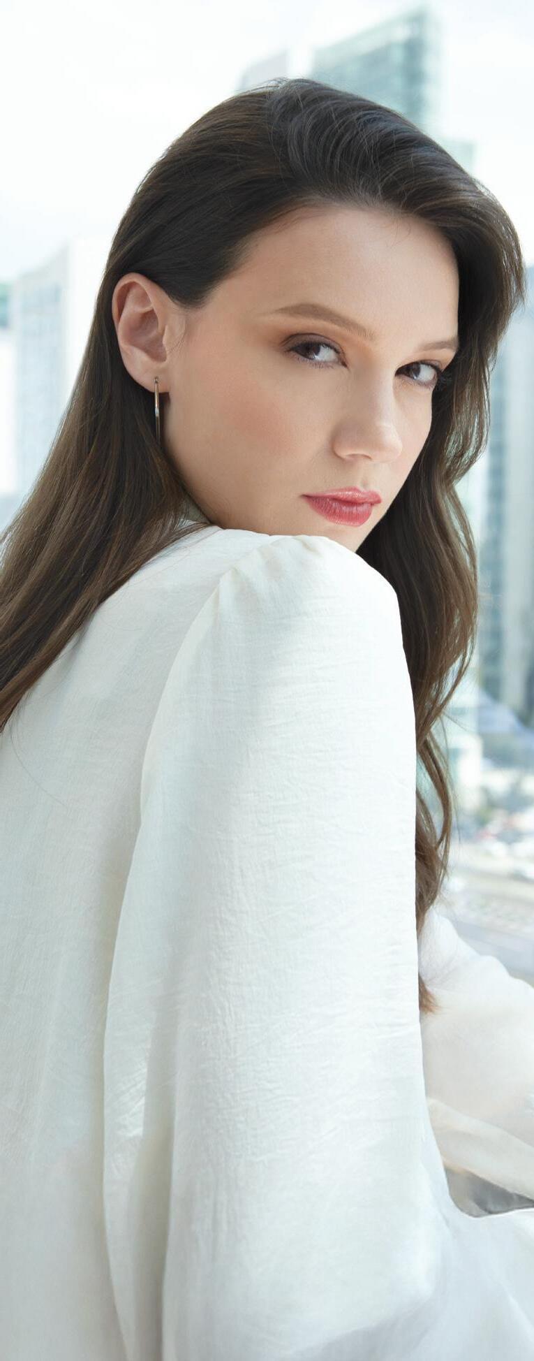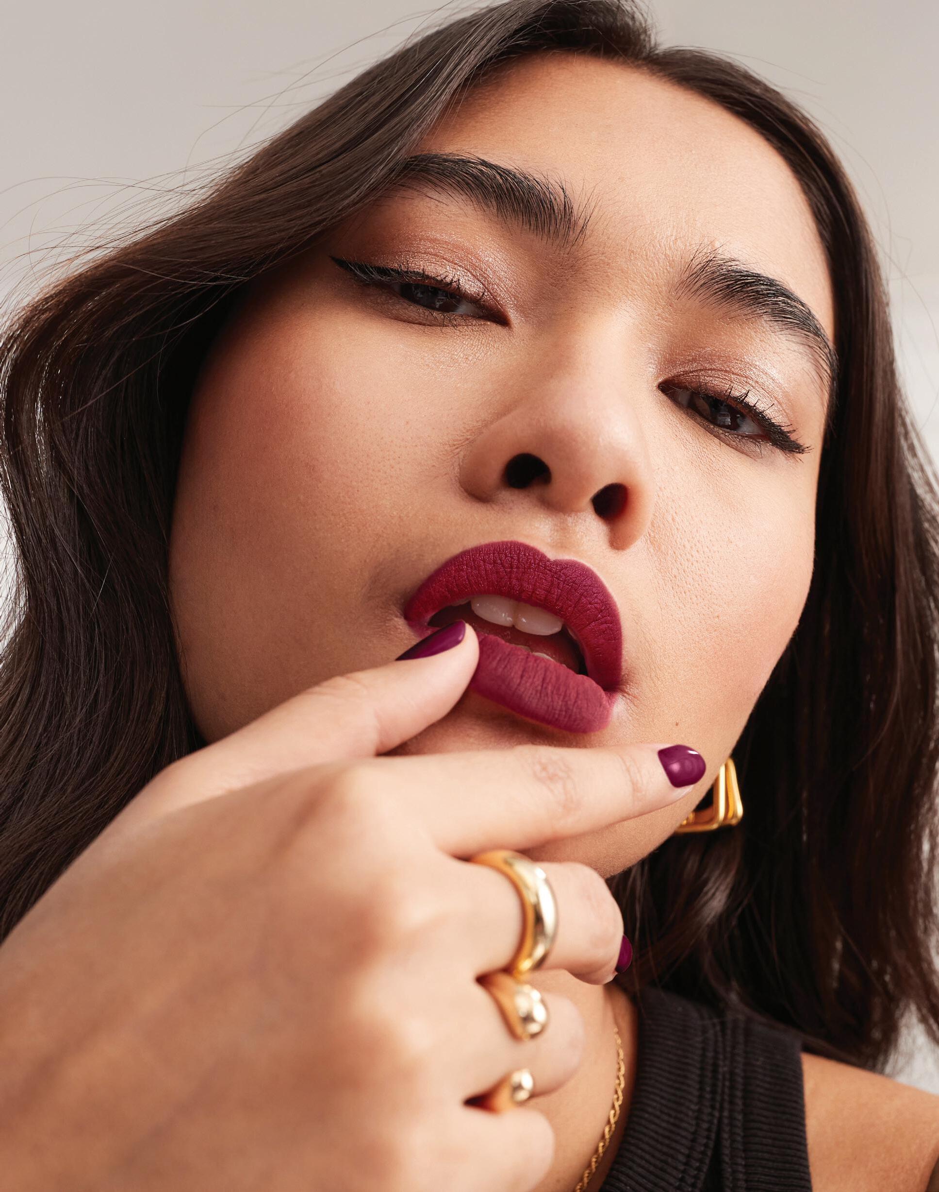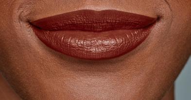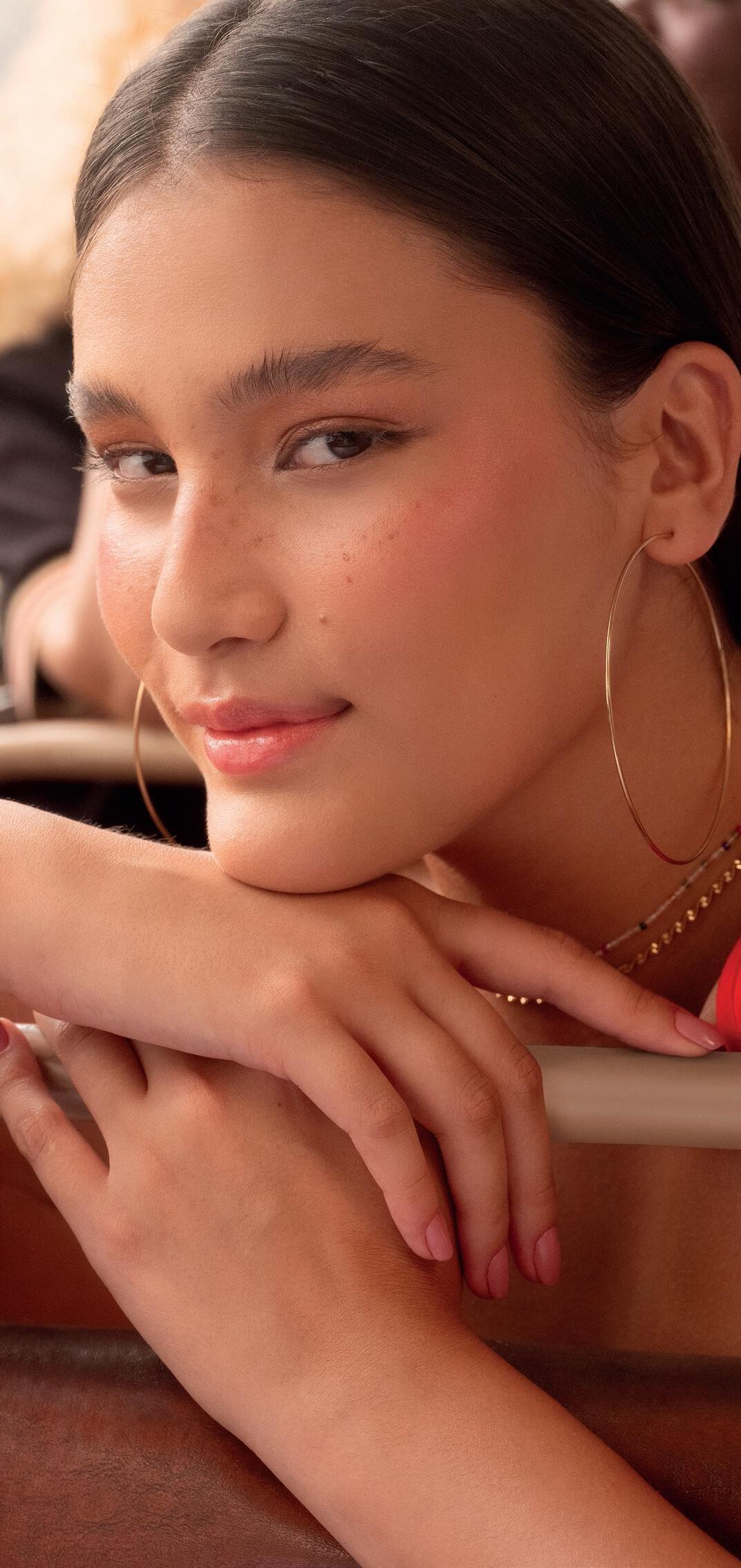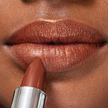 La modelo usa el Labial tono Chocolate Crush, el Brillo Labial Crystal Clear