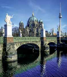 livre para visitar o centro histórico da cidade, praticamente intacto, no qual se destacam a catedral de Santa María e a igreja de São Severo, únicas na Europa de obras-primas arquitetônicas do gótico alemão, as casas em enxaimel e de Claro Kammer Brucke, a ponte mais longa da Europa repleta de casas com oficinas de artesãos, galerias, pequenas tabernas, lojas de música e antiguidades. Continuação para Berlim. Tempo livre para o primeiro contato com a capital da Alemanha. Jantar. Se desejar, você pode fazer uma excursão guiada opcional por Berlim noturno, na qual visitaremos o bairro judeu, o cenário da trágica “noite de vidros quebrados” durante o período de Hitler, o bairro do governo com o Reichstag e a Chancelaria, a Puerta de Brandenburg, Postdamer Platz, etc. Acomodação