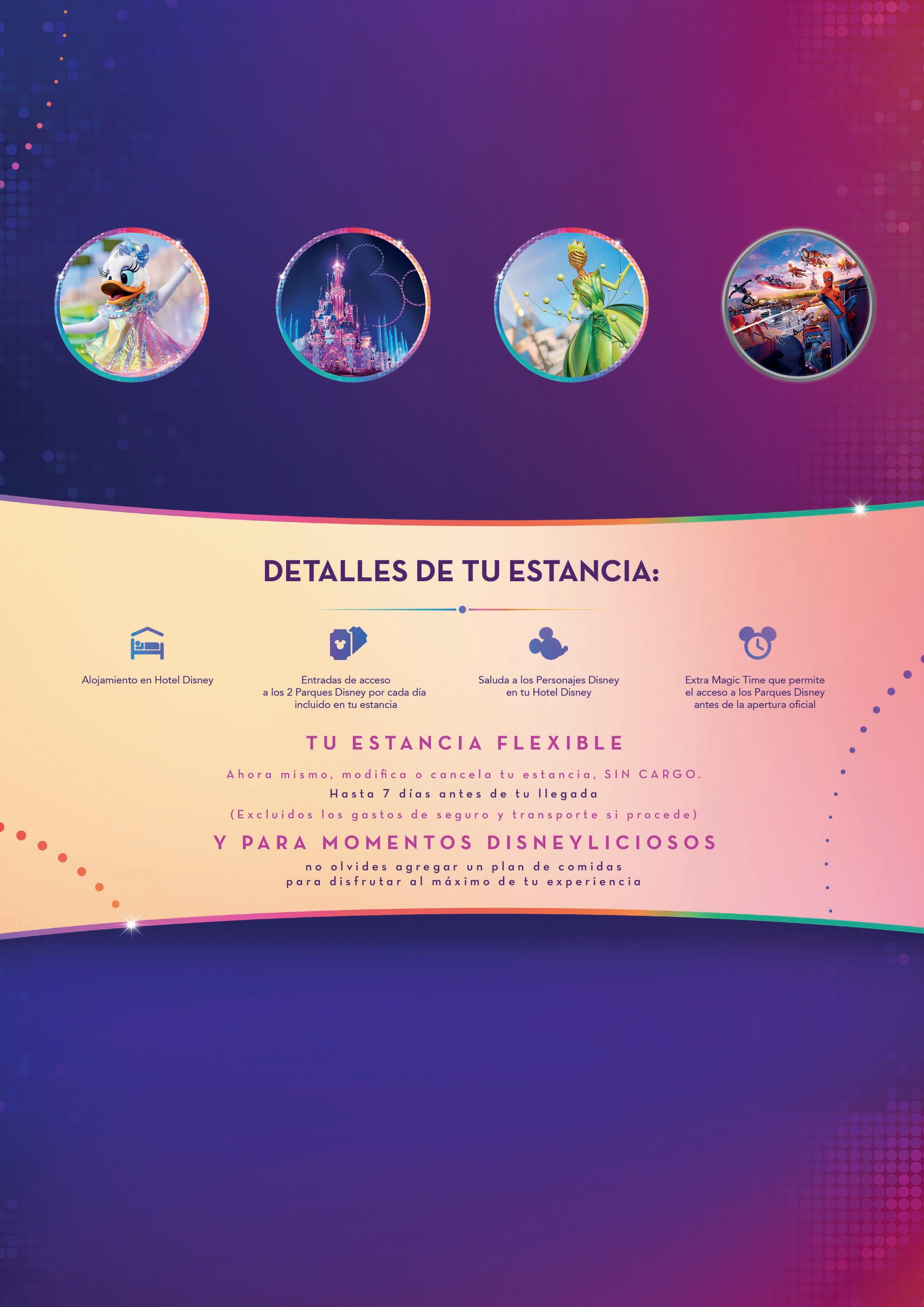 Condiciones: (1) Autobús no disponible para Disney Davy Crockett Ranch y de pago para Villages Nature®Paris by Center Parcs. (2) Excepto en Disney Davy Crockett Ranch (3) Al alojarte en un Hotel Disney o Villages Nature® Paris by Center Parcs, podrás disfrutar de más momentos de magia en los Parques Disney antes de la apertura oficial. Las condiciones corresponden a las establecidas en el momento de la publicación. Extra Magic Time está sujeto a disponibilidad y puede variar en los Parques Disney.