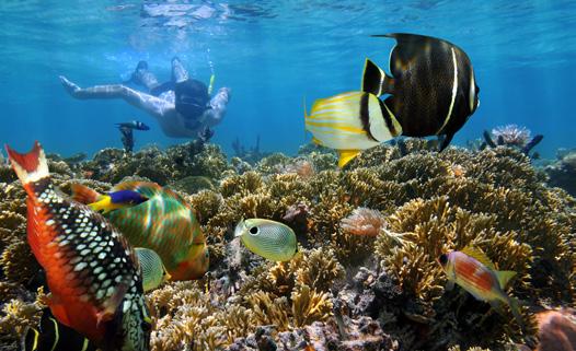 Es usual que los juguetones delfines se puedan ver en casi cual quier época del año, pero las ballenas tienen distintas tempora das de migración y para los fanáticos de la observación de aves, es habitual ver el piquero pardo y la magnífica ave fragata, es tas especies se consideran pelágicas; esto significa que pasan la mayor parte del tiempo en mar abierto, con breves períodos de descanso en pequeños islotes o bosques a la deriva. Después de recorrer la costa, el catamarán se detendrá frente a una bahía apartada donde hay un lugar para bucear en una roca que sobre sale del agua, lo que atrae a muchos peces.