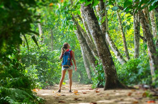 El parque está ubicado a 20 minutos aproximadamente de la ma yoría de los hoteles de Manuel Antonio, y una vez que el trans porte de turismo lo traslade hasta la puerta principal, mantenga su cámara a mano, ya que estará caminando por la selva tropical a lo largo de un sendero de 1,5 km de fácil acceso, en un tiempo estimado de 3 horas. El guía experimentado naturalista llevará consigo un telescopio de alta potencia, que les ayudará a obser var la abundante flora y fauna en su hábitat natural que, por sus excelentes características de camuflaje, detectarlos puede ser un poco complicado. La flora presente en este parque nacional es asombrosa, e incluye desde las coloridas flores tropicales y orquí deas, hasta los imponentes árboles del bosque lluvioso primario y secundario, que sirven de hogar a cientos de animales de vida silvestre, incluyendo monos aulladores, cariblancos y titi, además de iguanas, aves coloridas como tucanes, perezosos, mapaches, venado cola blanca, cangrejos y agutis. Además, si se cuenta con suerte, se podrá observar la hermosa rana venenosa y muchas especies más, mientras aprende sobre la dieta, los hábitos y mu chos datos interesantes sobre la variedad de especies que encon trará durante esta increíble aventura en la naturaleza.