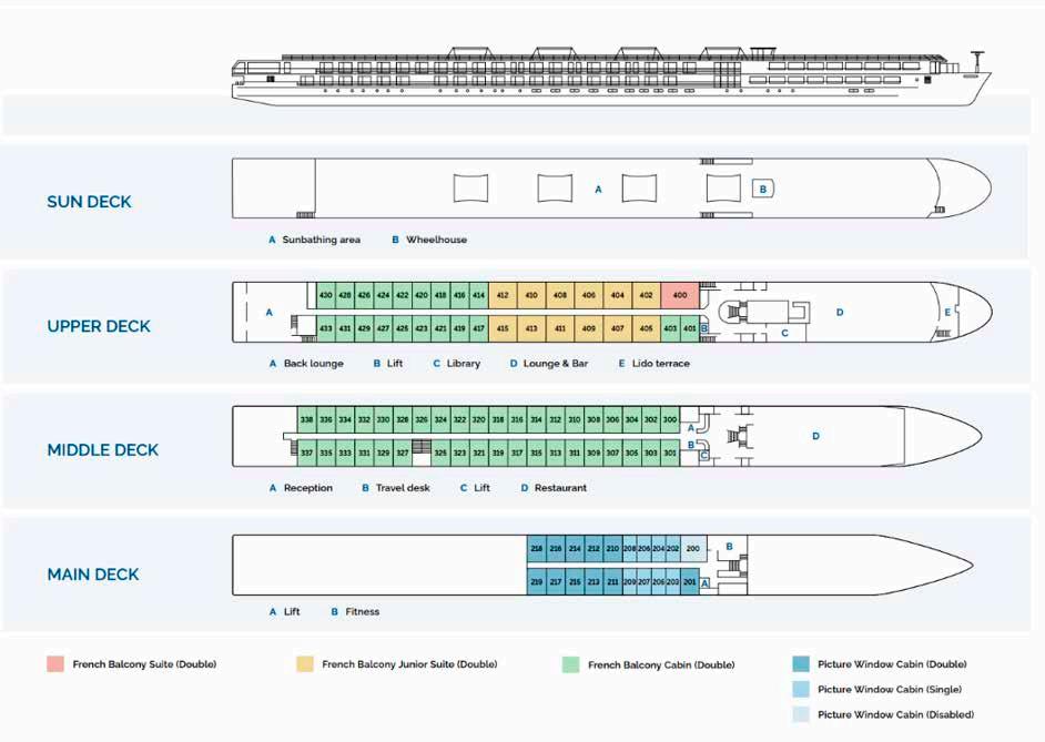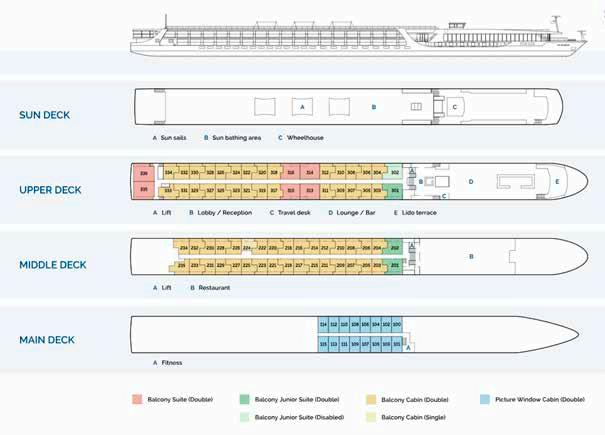 • Los cruceros fluviales tienen unas medidas de 135 metros de largo y 11,40 metros de ancho. Con capacidad aproximada de 150 a 180 pasajeros, dos o tres pisos y una cubierta superior.