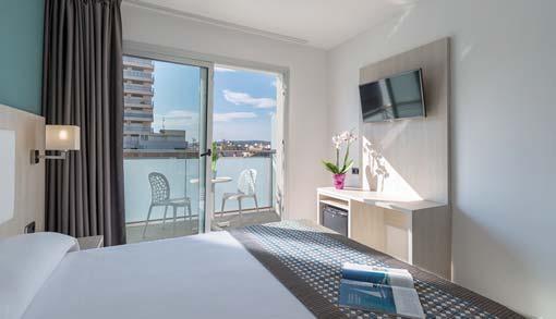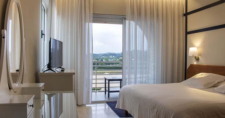 Quartos com design fresco e luz natural, com uma acolhedora varanda, TV 32”, banho privado, secador e minibar. Ideal para descansar com tudo o que é necessário e ao alcance da mão.