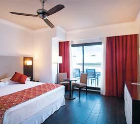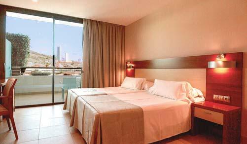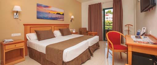 O hotel dispõe de 130 quartos exteriores com varanda mobilada, com casa de banho completa com secador de cabelo e duche com coluna de hidromassagem, telefone, climatização,Tv, cofre e minibar (opcional e pago).