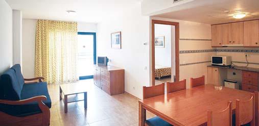 Compostos de 1 e 2 quartos, com sala (sofá cama), cozinha incorporada na sala, quarto, banho completo e varanda. Os de 2 quartos são de idêntica composição mas com um quarto mais. Todos estão equipados com utensílios de cozinha, frigorífico, Tv. via satélite.