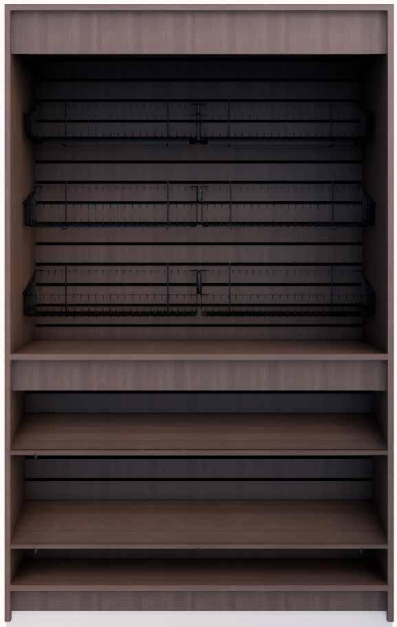 The LB Slatwall Lock N Load Display is a durable steel solution. Available in 4ft, 3ft, and 2ft sizes, featuring three 19” wire shelves, a 19” countertop with slatwall, 10 slatwall pegs and two baskets. Designed for efficiency and easy organization, it’s fully compatible with GTP pushers and dividers, offering flexibility with adjustable shelving.