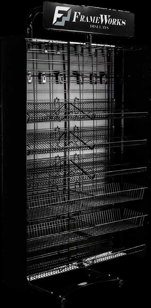 Compact, lightweight, and built to last, the FrameWorker Mini is ideal for smaller locations where space is at a premium. Designed to hold either a 24” or 36” grid wall, this free-standing fixture comes complete with standard shelves, baskets, and peg hooks—everything you need for a quick and flexible merchandising setup.