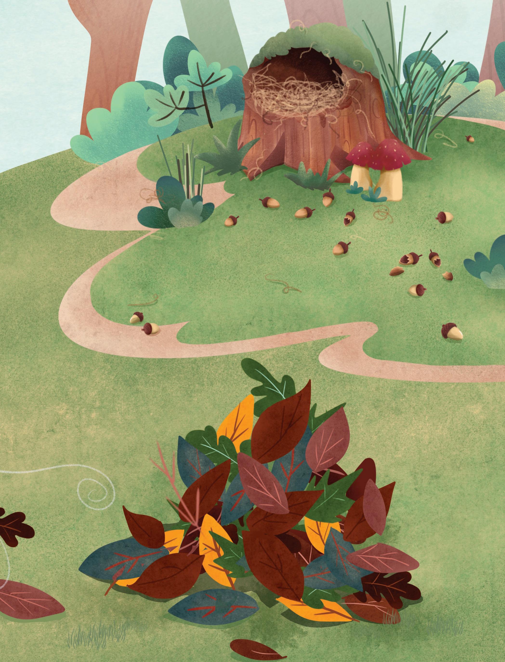 ...he never picked up after himself. His cosy (1) den was filled with acorns, twigs and leaves, making it a messy (2) home for him.