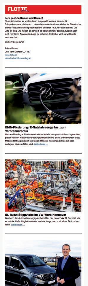 Und auch an dieser Stelle bitte ich Sie, sich den 27. Juni rot in Ihrem Kalender anzustreichen, da geht nämlich die bereits 8. Auflage von Österreichs größtem unabhängigen Fuhrparkevent, die FLEET Convention, in der Wiener Hofburg über die Bühne. Fachwissen gibt es jedoch schon früher, die FLOTTE WISSEN Live Webinare finden am 19. und 26. April jeweils von 10:00 bis circa 11:30 Uhr statt, alle Infos dazu unter www.flotte-live.at beziehungsweise in unserem Newsletter, den Sie unter www.flotte.at abonnieren können.
